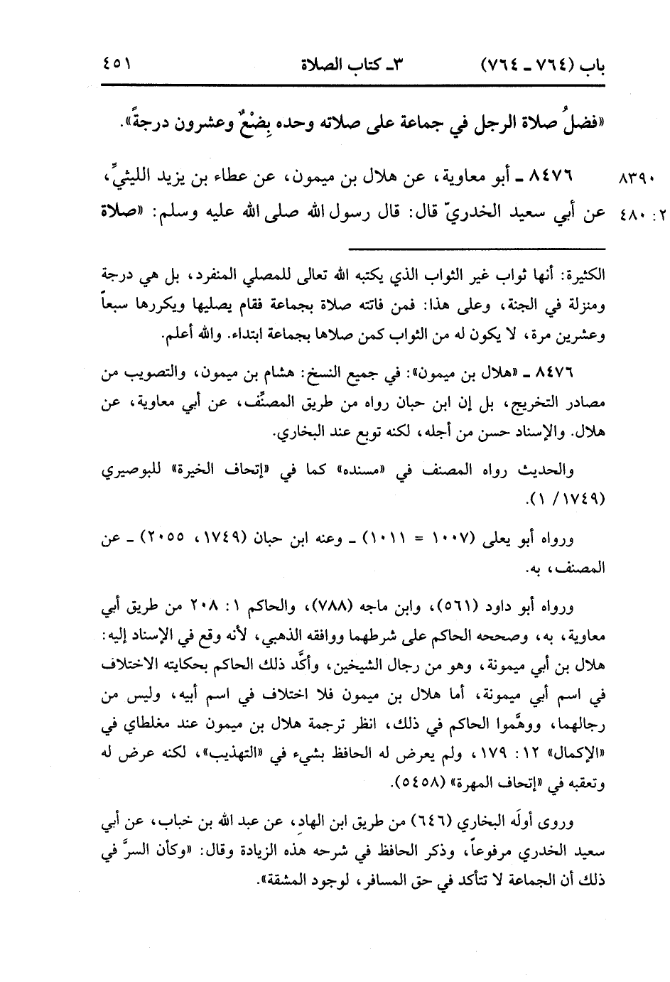 8476- حَدَّثَنَا أَبُو مُعَاوِيَةَ ، عَنْ هِلالِ بْنِ مَيْمُونٍ ، عَنْ عَطَاءِ بْنِ يَزِيدَ اللَّيْثِيِّ ، عَنْ أَبِي سَعِيدٍ الْخُدْرِيِّ ، قَالَ : قَالَ رَسُولُ اللهِ صَلَّى الله عَلَيْهِ وَسَلَّمَ : صَلاَةُ الرَّجُلِ فِي جَمَاعَةٍ تَزِيدُ عَلَى صَلاَتِهِ وَحْدَهُ خَمْسًا وَعِشْرِينَ دَرَجَةً ، وَإِنْ صَلاَّهَا بِأَرْضِ فَلاَةٍ فَأَتَمَّ وُضُوءَهَا وَرُكُوعَهَا وَسُجُودَهَا بَلَغَتْ صَلاَتُهُ خَمْسِينَ دَرَجَةً. (2/479).