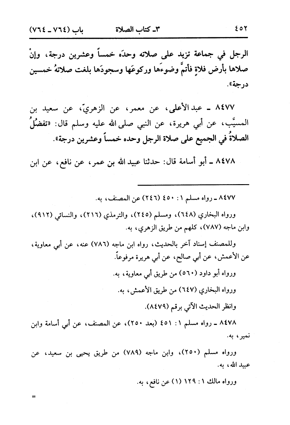 8478- حَدَّثَنَا أَبُو أُسَامَةَ , قَالَ : حدَّثَنَا عُبَيْدِ اللهِ بْنُ عُمَرَ ، عَنْ نَافِعٍ ، عَنِ ابْنِ عُمَرَ ، قَالَ : قَالَ رَسُولُ اللهِ صَلَّى الله عَلَيْهِ وَسَلَّمَ : صَلاَةُ الرَّجُلِ فِي جَمَاعَةٍ تَفْضُلُ عَلَى صَلاَتِهِ وَحْدَهُ بِسَبْعٍ وَعِشْرِينَ دَرَجَةً. (2/480).
