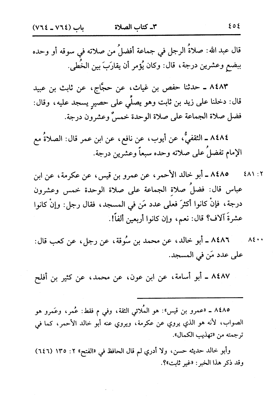 8487- حَدَّثَنَا أَبُو أُسَامَةَ ، عَنِ ابْنِ عَوْنٍ ، عَنْ مُحَمَّدٍ ، عَنْ كَثِيرِ بْنِ أَفْلَحَ ، قَالَ : كُنَّا بِالْمَدِينَةِ فِي دَارِ أَبِي يُوسُفَ فِي حِسَابٍ لَنَا نَحْسِبُهُ وَمَعَنَا زَيْدُ بْنُ ثَابِتٍ ، فَقَالَ : صَلاَةُ الرَّجُلِ مَعَ الإِمَامِ تُضَعَّفُ عَلَى صَلاَتِهِ وَحْدَهُ بِضْعًا وَعِشْرِينَ دَرَجَةً. (2/481).