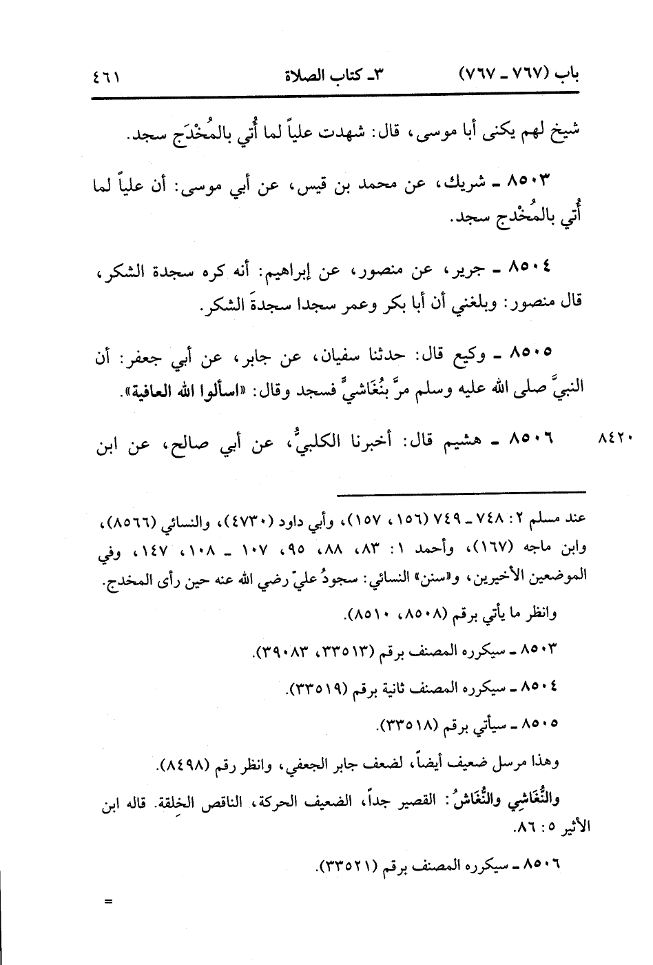 8505- حَدَّثَنَا وَكِيعٌ , قَالَ : حدَّثَنَا سُفْيَانُ ، عَنْ جَابِرٍ ، عَنْ أَبِي جَعْفَرٍ ؛ أَنَّ النَّبِيَّ صَلَّى الله عَلَيْهِ وَسَلَّمَ مَرَّ بنُغْاشَيّ فَسَجَدَ وَقَالَ : اسْأَلُوا اللَّهَ الْعَافِيَةَ. (2/483).