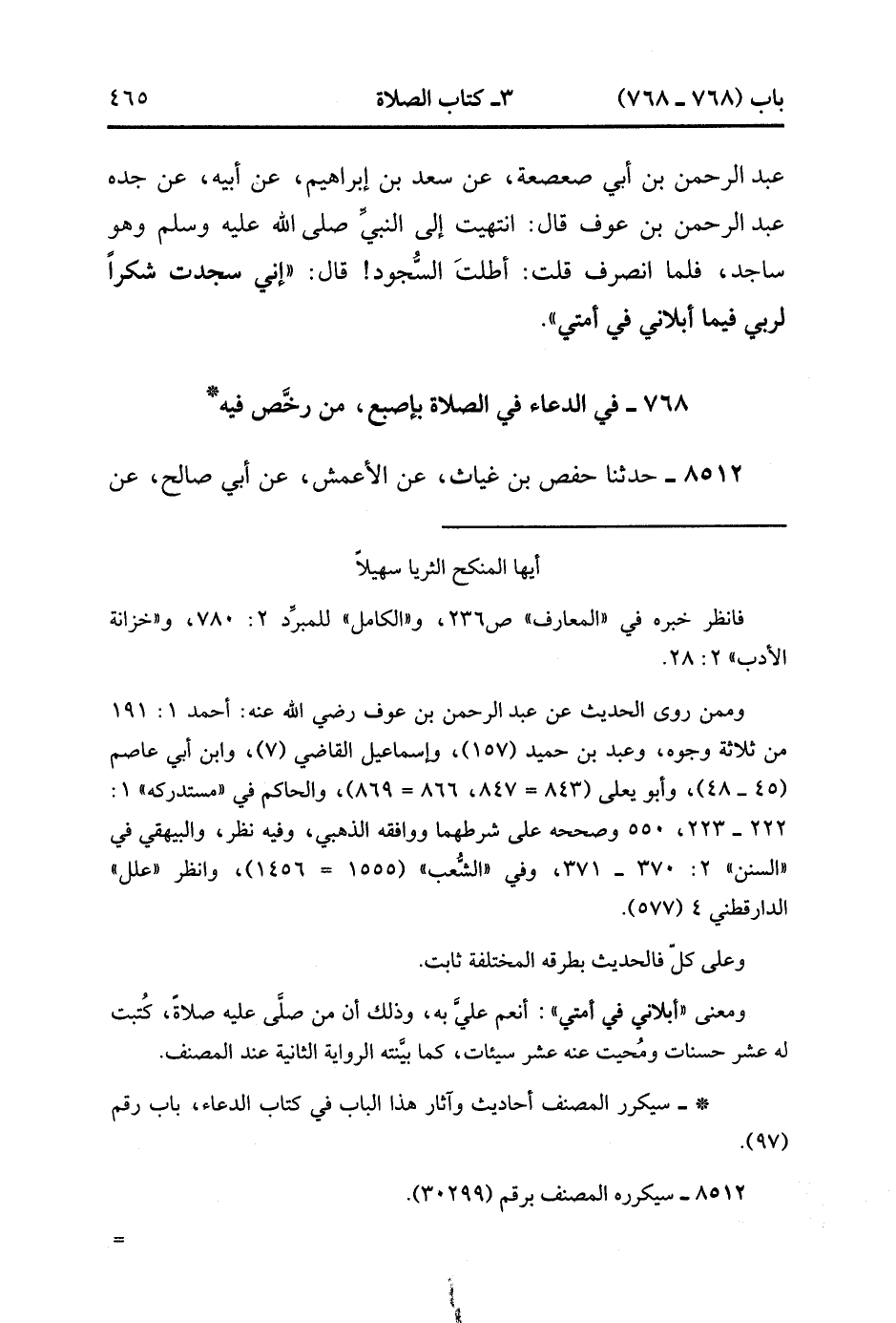 8511- حَدَّثَنَا زَيْدُ بْنُ حُبَابٍ , قَالَ : حدَّثَنَا مُوسَى بْنُ عُبَيْدَةَ ، عَنْ قَيْسِ بْنِ عَبْدِ الرَّحْمَنِ بْنِ أَبِي صَعْصَعَةَ ، عَنْ سَعْدِ بْنِ إِبْرَاهِيمَ ، عَنْ أَبِيهِ ، عَنْ جَدِّهِ عَبْدِ الرَّحْمَنِ بْنِ عَوْفٍ ، قَالَ : انْتَهَيْتُ إلَى النَّبِيِّ صَلَّى الله عَلَيْهِ وَسَلَّمَ وَهُوَ ساجِدٌ ، فَلَمَّا انْصَرَفَ قُلْتُ : أَطَلْت السُّجُودَ ، قَالَ : إنِّي سَجَدْتُ شُكْرًا لِرَبِّي فِيمَا أَبْلاَنِي فِي أُمَّتِي.