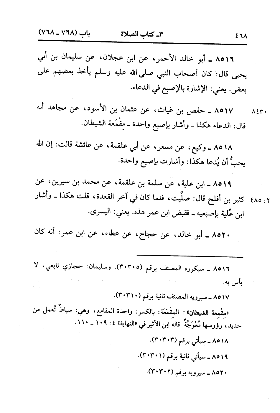 8520- حَدَّثَنَا أَبُو خَالِدٍ ، عَنْ حَجَّاجٍ ، عَنْ عَطَاءٍ ، عَنِ ابْنِ عُمَرَ : أَنَّهُ كَانَ يُشِيرُ بِإِصْبَعِهِ فِي الصَّلاَةِ. (2/485).