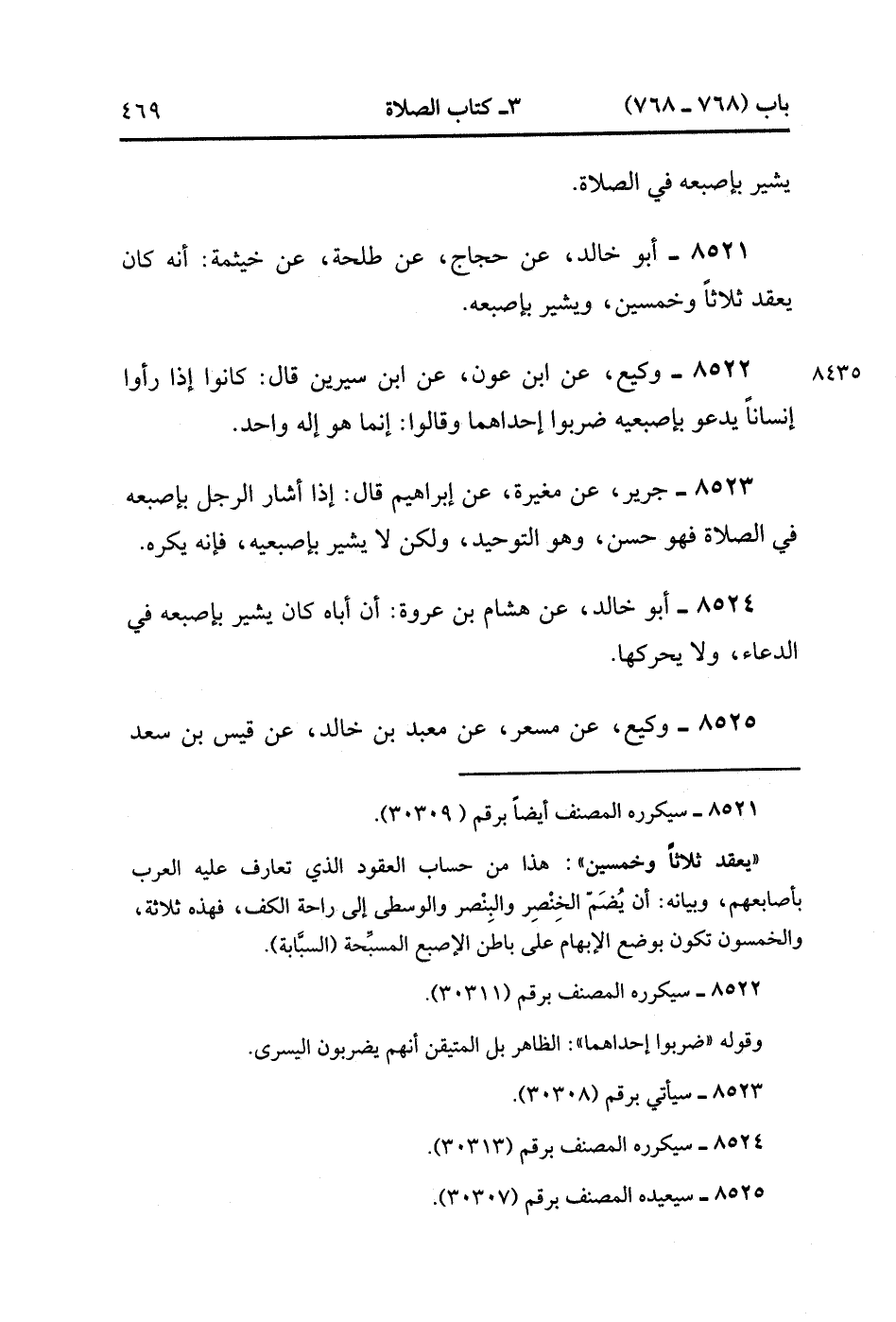 8521- حَدَّثَنَا أَبُو خَالِدٍ ، عَنْ حَجَّاجٍ ، عَنْ طلحة ، عَنْ خَيْثَمَةَ : أَنَّهُ كَانَ يَعْقِدُ ثَلاَثَاً وَخَمْسِينَ ، وَيُشِيرُ بِإِصْبَعِهِ.