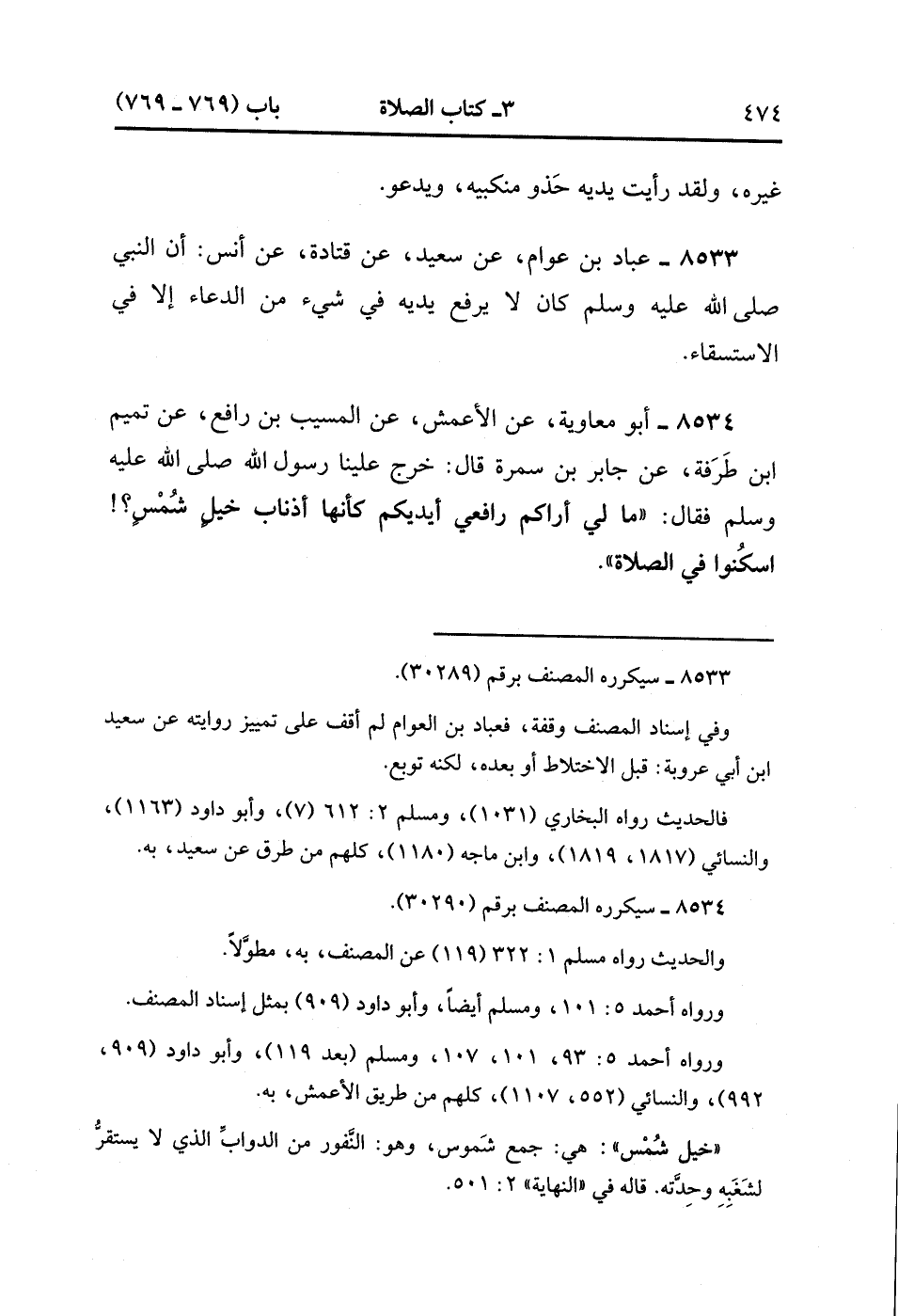 8534- حَدَّثَنَا أَبُو مُعَاوِيَةَ ، عَنِ الأَعْمَشِ ، عَنِ الْمُسَيَّبِ بْنِ رَافِعٍ ، عَنْ تَمِيمِ بْنِ طَرَفَةَ ، عَنْ جَابِرِ بْنِ سَمُرَةَ ، قَالَ : خَرَجَ عَلَيْنَا رَسُولُ اللهِ صَلَّى الله عَلَيْهِ وَسَلَّمَ ، فَقَالَ : مَا لِي أَرَاكُمْ رَافِعِي أَيْدِيكُمْ أَنَّهَا أَذْنَابُ خَيْلٍ شُمْسٍ ، اسْكُنُوا فِي الصَّلاَةِ. (2/486).