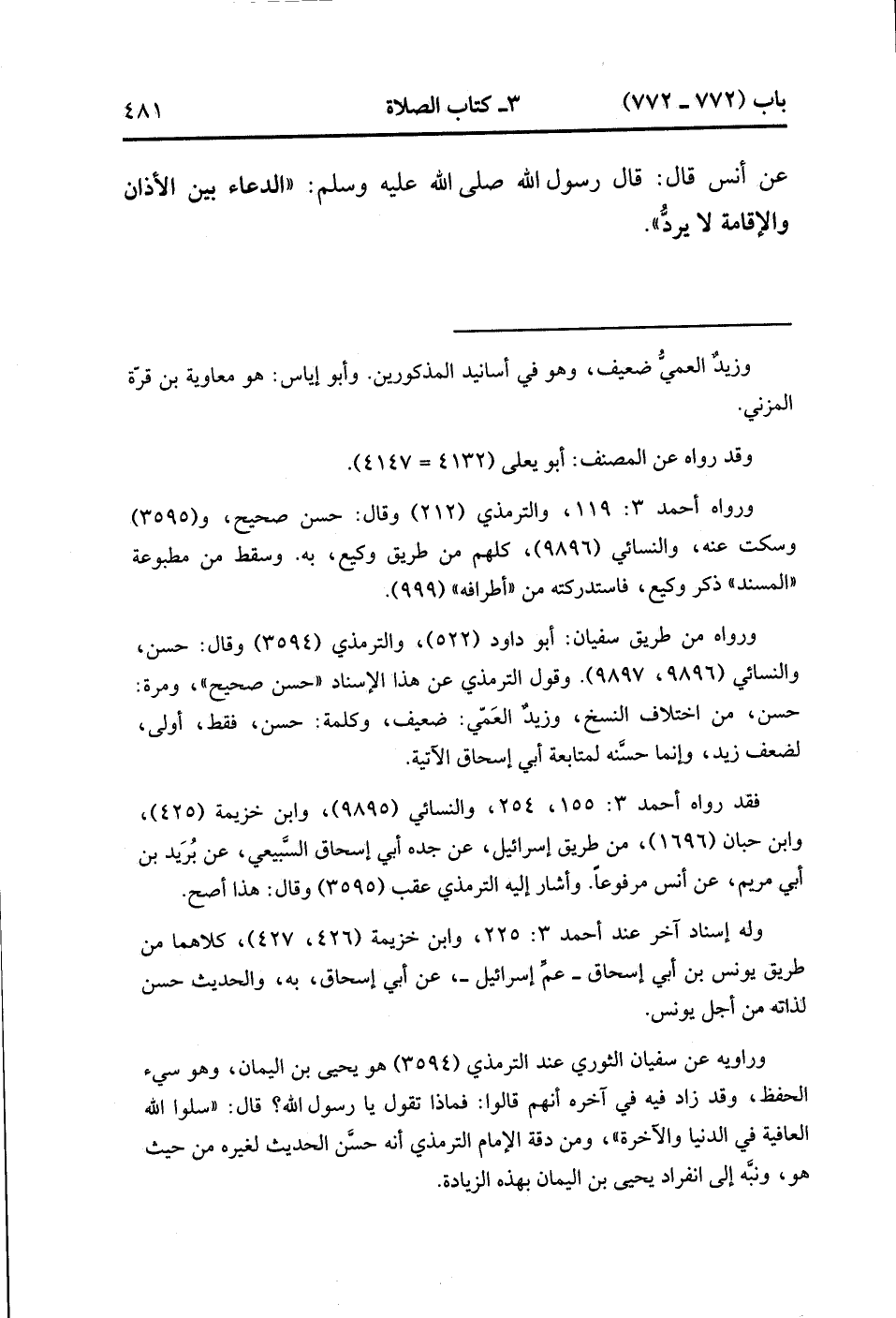 8552- حَدَّثَنَا وَكِيعٌ ، عَنْ سُفْيَانَ ، عَنْ زَيْدٍ الْعَمِّيِّ ، عَنْ أَبِي إيَاسٍ ، عَنْ أَنَسٍ ، قَالَ : قَالَ رَسُولُ اللهِ صَلَّى الله عَلَيْهِ وَسَلَّمَ : الدُّعَاءُ بَيْنَ الأَذَانِ وَالأَقَامَةِ لاَ يُرَدُّ. (2/488).