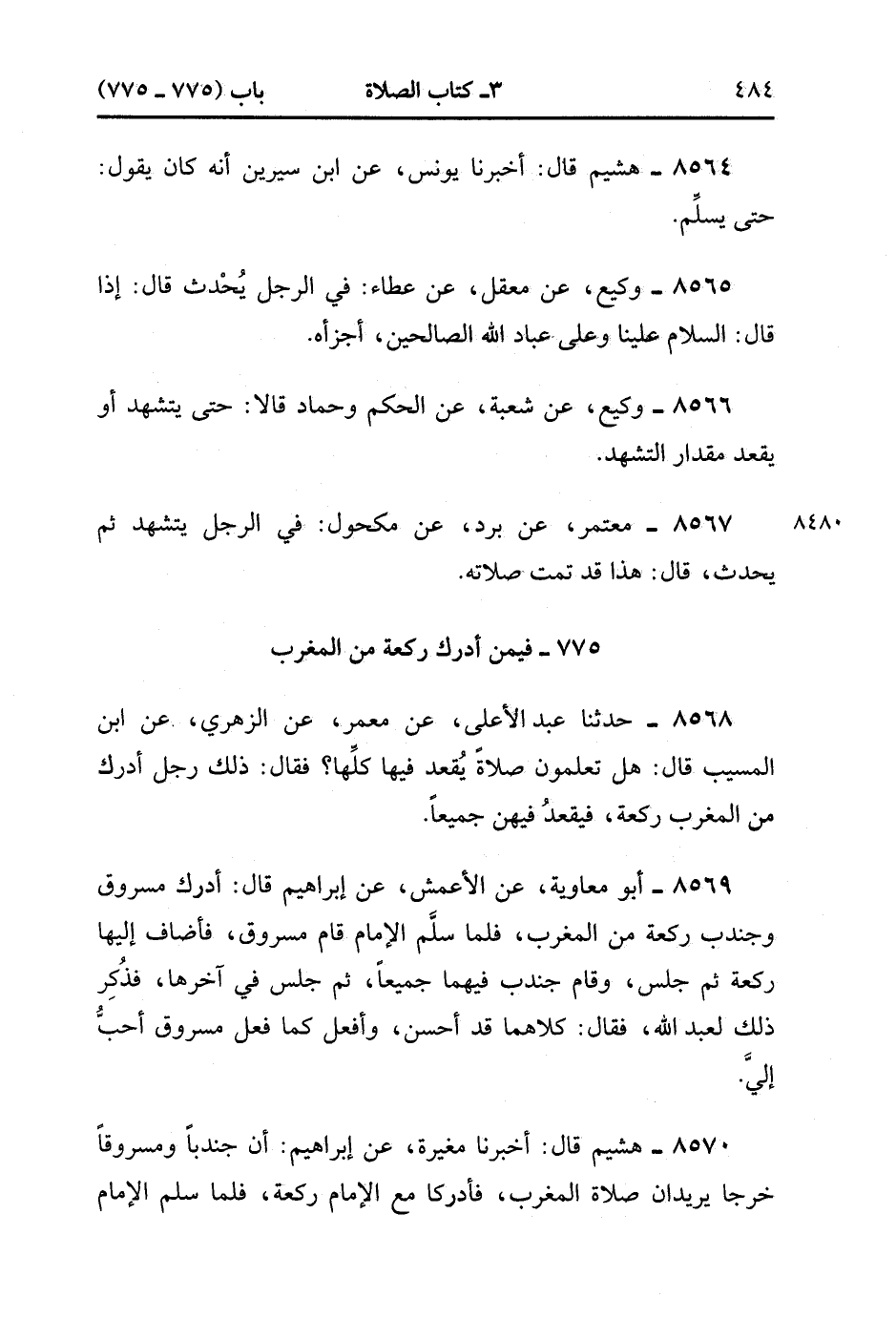 8568- حدَّثَنَا عَبْدُ الأَعْلَى ، عَنْ مَعْمَرٍ ، عَنِ الزُّهْرِيِّ ، عَنِ ابْنِ الْمُسَيَّبِ ، قَالَ : هَلْ تَعْلَمُونَ صَلاَةً يُقْعَدُ فِيهَا كُلِّهَا ؟ فَقَالَ : ذَلكَ رَجُلٌ أَدْرَكَ مِنَ الْمَغْرِبِ رَكْعَةً فَيَقْعُدُ فِيهِنَّ جَمِيعًا.
