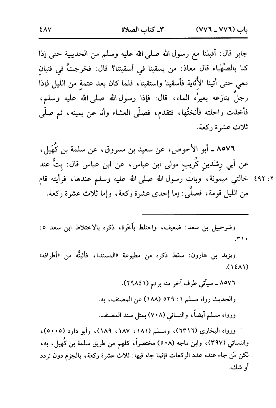 8576- حَدَّثَنَا أَبُو الأَحْوَصِِ ، عَنْ سَعِيدٍ بْنِ مَسْرُوقٍ ، عَنْ سَلَمَةَ بْنِ كُهَيْلٍ ، عَنْ أَبِي رِشْدِينَ كُرَيْبٍ مَوْلَى ابْنِ عَبَّاسٍ ، عَنِ ابْنِ عَبَّاسٍ ، قَالَ : بِتّ عِنْدَ خَالَتِي مَيْمُونَةَ وَبَاتَ رَسُولُ اللهِ صَلَّى الله عَلَيْهِ وَسَلَّمَ عِنْدَهَا فَرَأَيْتُهُ قَامَ مِنَ اللَّيْلِ قَوْمَةً فَصَلَّى إمَّا إحْدَى عَشْرَةَ رَكْعَةً وَإِمَّا ثَلاَثَ عَشْرَةَ رَكْعَةً. (2/491).