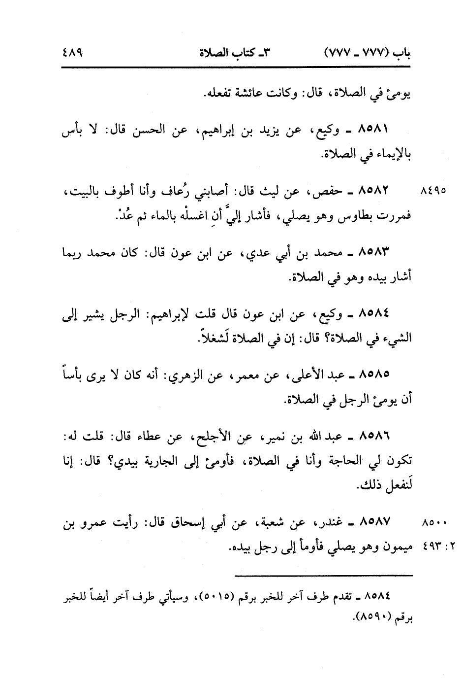 8587- حَدَّثَنَا غُنْدَرٌ ، عَنْ شُعْبَةَ ، عَنْ أَبِي إِسْحَاقَ ، قَالَ : رَأَيْتُُ عَمْرَو بْنَ مَيْمُونٍ وَهُوَ يُصَلِّي فَأَوْمَأَ إلَى رَجُلٍ بِيَدِهِ. (2/493).
