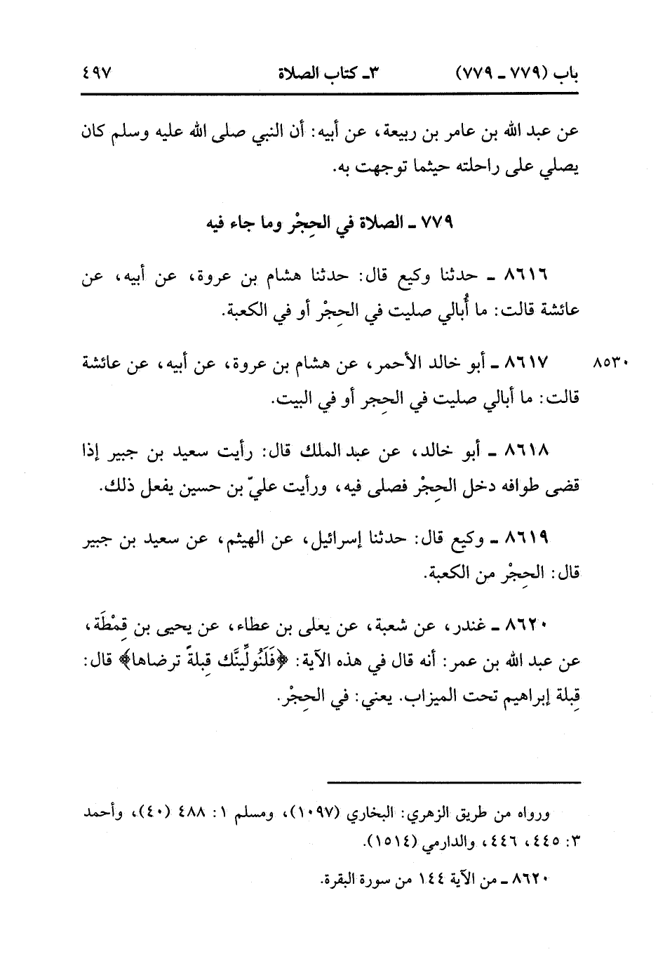 8620- حَدَّثَنَا غُنْدَرٌ ، عَنْ شُعْبَةَ ، عَنْ يَعْلَى بْنِ عَطَاءٍ ، عَنْ يَحْيَى بْنِ قِمطَةَ ، عَنْ عَبْدِ اللهِ بْنِ عُمَرَ : أَنَّهُ قَالَ فِي هَذِهِ الآيَةِ {فَلَنُوَلِّيَنَّكَ قِبْلَةً تَرْضَاهَا} قَالَ : قِبْلَةُ إبْرَاهِيمَ تَحْتَ الْمِيزَابِ ، يَعْنِي فِي الْحِجْرِ. (2/496).