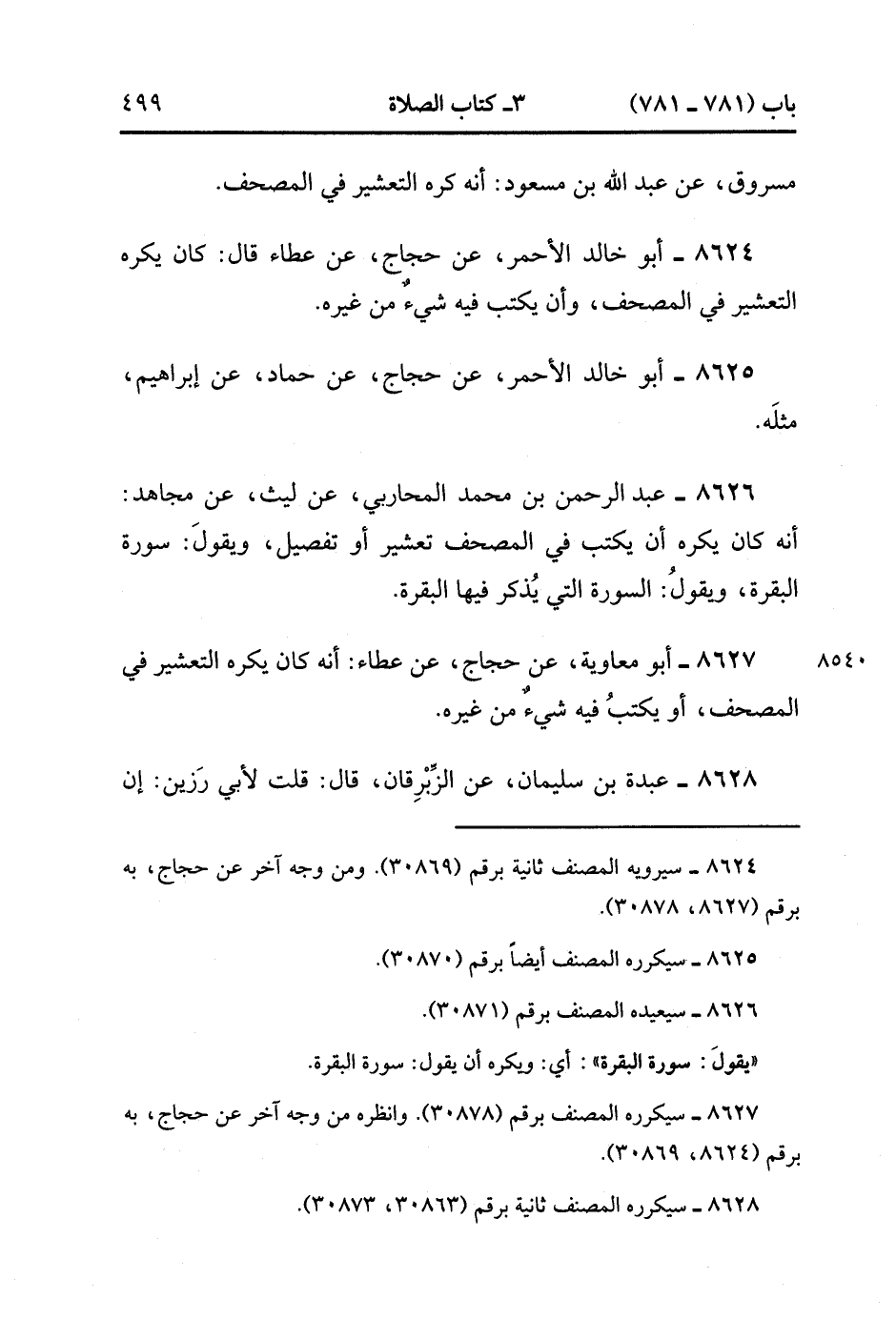 8624- حَدَّثَنَا أَبُو خَالِدٍ الأَحْمَرِِ ، عَنْ حَجَّاجٍ ، عَنْ عَطَاءٍ ، قَالَ : كَانَ يُكْرَهُ التَّعْشِيرَ فِي الْمُصْحَفِ ، وَأَنْ يُكْتَبَ فِيهِ شَيْءٌ مِنْ غَيْرِهِ.