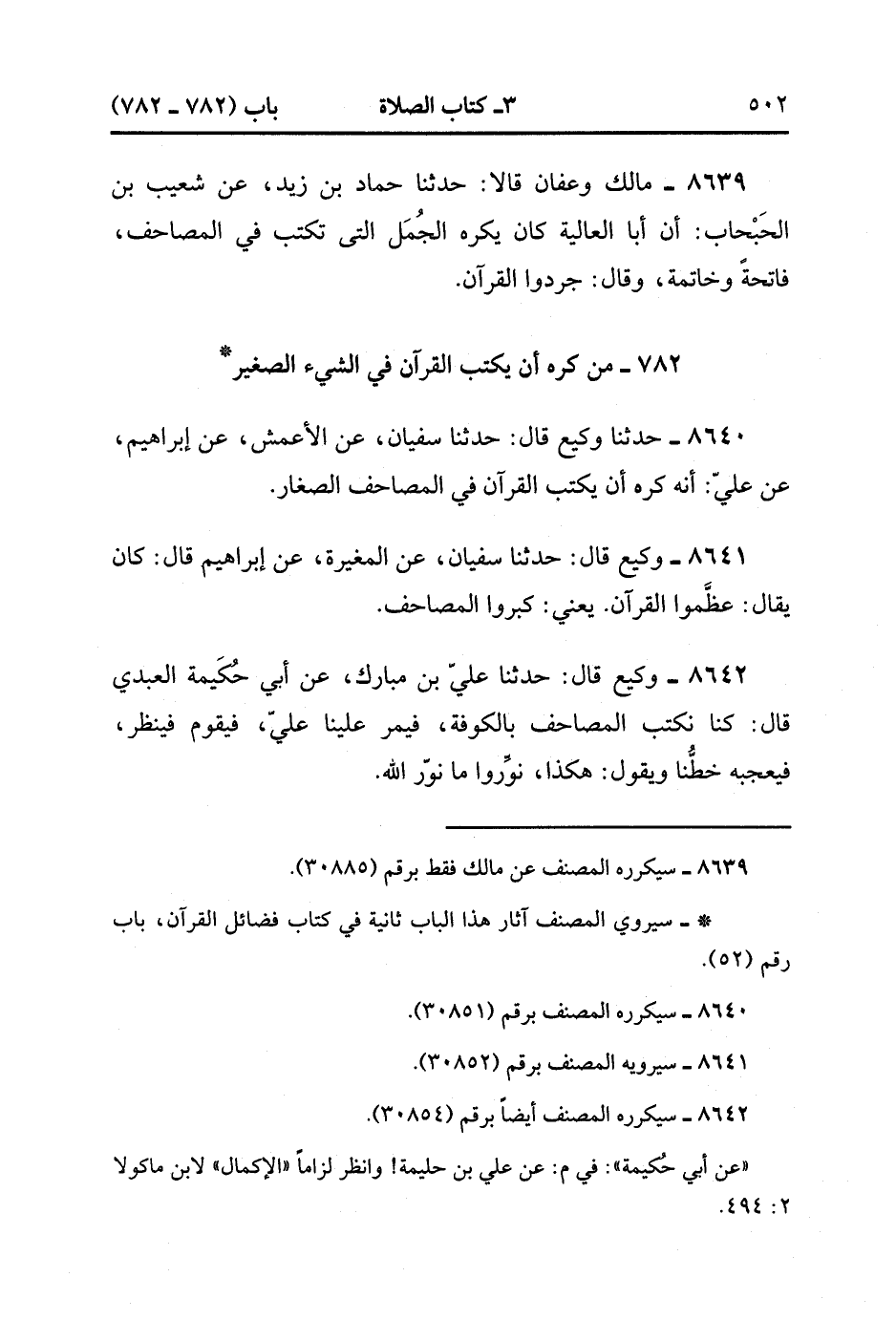 8640- حَدَّثَنَا وَكِيعٌ , قَالَ : حدَّثَنَا سُفْيَانُ ، عَنِ الأَعْمَشِ ، عَنْ إِبْرَاهِيمَ ، عَنْ عَلِيٍّ : أَنَّهُ كَرِهَ أَنْ يُكْتَبَ الْقُرْآنُ فِي الْمَصَاحِفِ الصِّغَارِ.