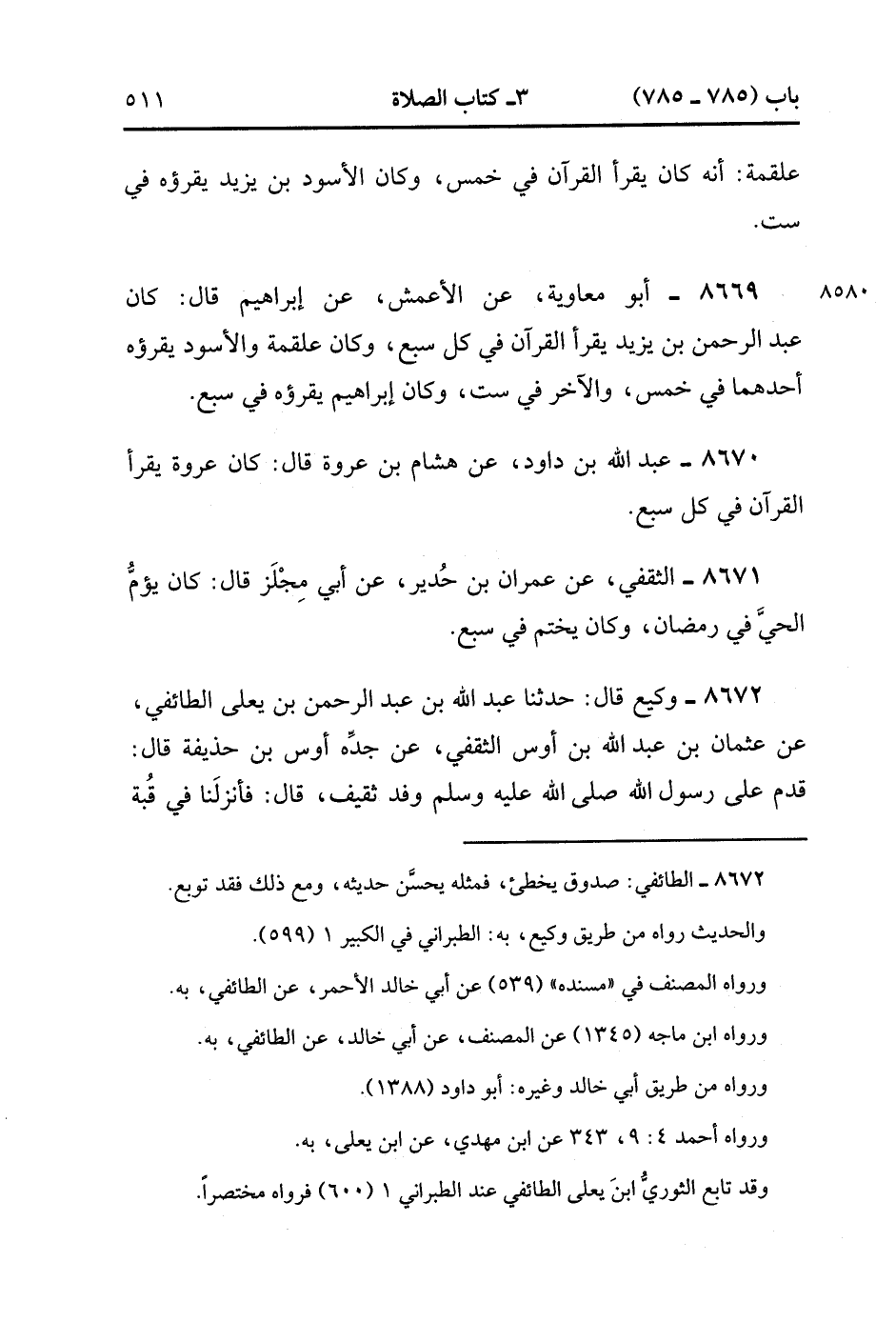 8669- حَدَّثَنَا أَبُو مُعَاوِيَةَ ، عَنِ الأَعْمَشِ ، عَنْ إبْرَاهِيمَ ، قَالَ : كَانَ عَبْدُ الرَّحْمَنِ بْنُ يَزِيدَ يَقْرَأُ الْقُرْآنَ فِي كُلِّ سَبْعٍ ، وَكَانَ عَلْقَمَةُ وَالأَسْوَدُ يَقْرَؤُهُ أَحَدُهُمَا فِي خَمْسٍ وَالأَخَرُ فِي سِتٍّ ، وَكَانَ إبْرَاهِيمُ يَقْرَؤُهُ فِي سَبْعٍ.
