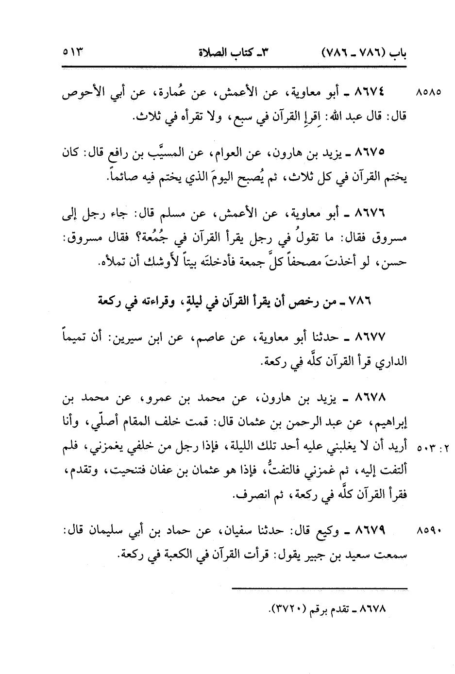 786- من رخص أَنْ يُقْرَأَ الْقُرْآنُ فِي لَيْلَةٍ وَقِرَاءَتُهُ فِي رَكْعَةٍ.