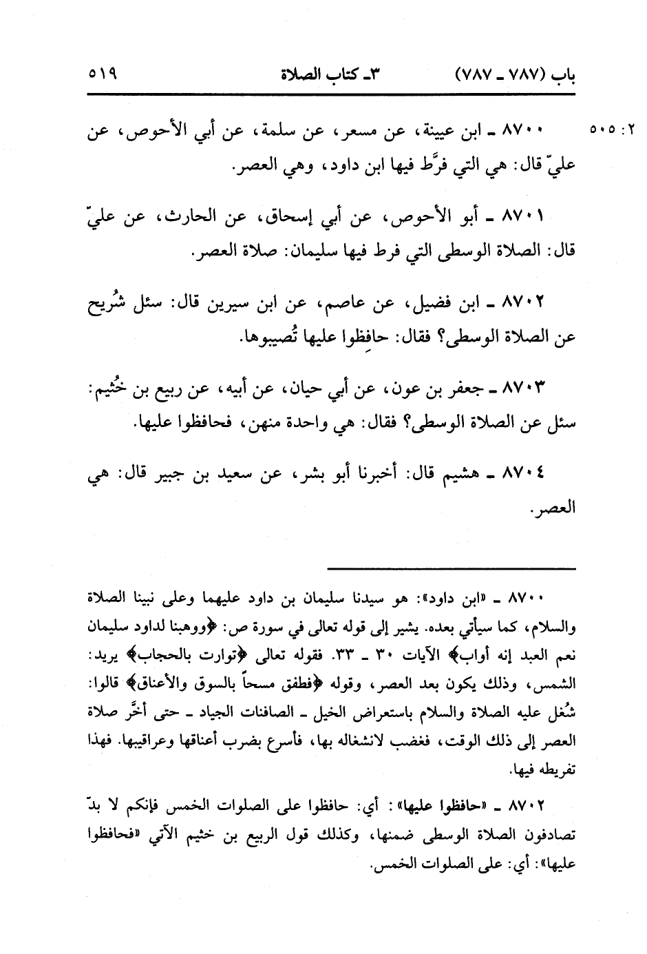 8701- حَدَّثَنَا أَبُو الأَحْوَصِ ، عَنْ أَبِي إِسْحَاقَ ، عَنِ الْحَارِثِ ، عَنْ عَلِيٍّ ، قَالَ : الصَّلاَة الْوُسْطَى الَّتِي فَرَّطَ فِيهَا سُلَيْمَانُ صَلاَةُ الْعَصْرِ.