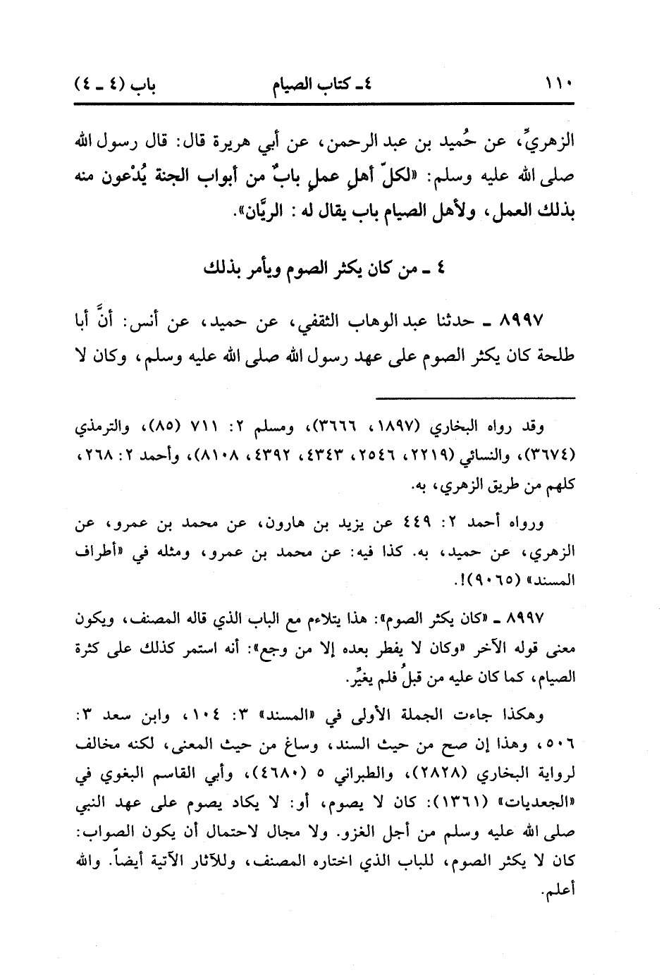 8997- حَدَّثَنَا عَبْدُ الْوَهَّابِ الثَّقَفِيُّ ، عَنْ حُمَيْدٍ ، عَنْ أَنَسٍ ؛ أَنَّ أَبَا طَلْحَةَ كَانَ يُكْثِرُ الصَّوْمَ عَلَى عَهْدِ رَسُولِ اللهِ صَلَّى الله عَلَيْهِ وَسَلَّمَ ، وَكَانَ لاَ يُفْطِرُ بَعْدَهُ إِلاَّ مِنْ وَجَعٍ. (3/7).