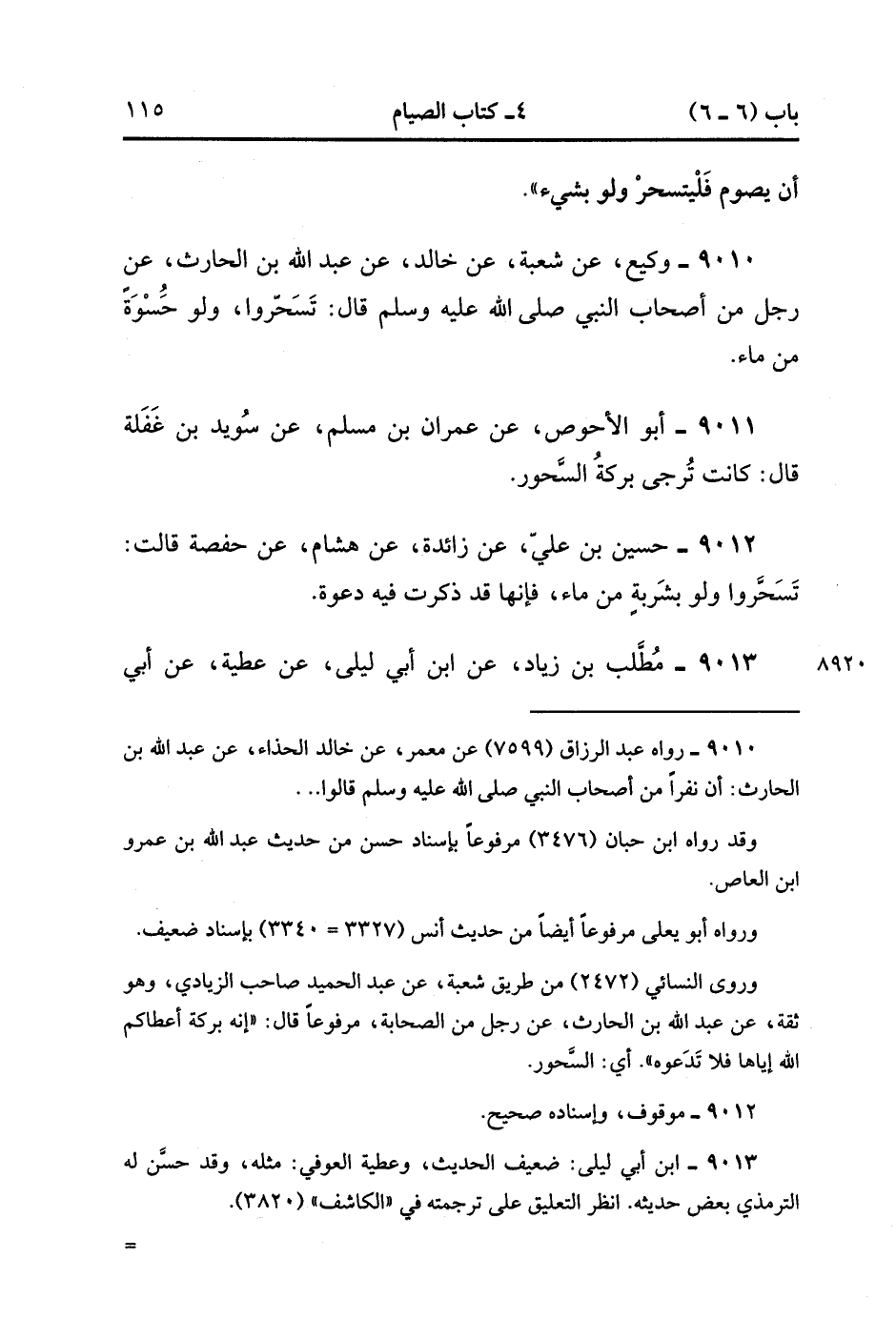 9010- حَدَّثَنَا وَكِيعٌ ، عَنْ شُعْبَةَ ، عَنْ خَالِدٍ ، عَنْ عَبْدِ اللهِ بْنِ الْحَارِثِ ، عَنْ رَجُلٍ مِنْ أَصْحَابِ النَّبِيِّ صَلَّى الله عَلَيْهِ وَسَلَّمَ ، قَالَ : تَسَحَّرُوا وَلَوْ حَسْوَةً مِنْ مَاءٍ.