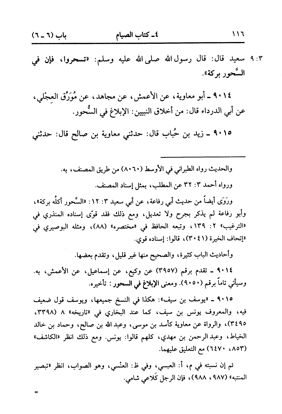 9014- حَدَّثَنَا أَبُو مُعَاوِيَةَ ، عَنِ الأَعْمَشِ ، عَنْ مُجَاهِدٍ ، عَنْ مُوَرِّقٍ الْعِجْلِيّ ، عَنْ أَبِي الدَّرْدَاءِ ، قَالَ : مِنْ أَخْلاَقِ النَّبِيِّينَ الإِبْلاَغَ فِي السُّحُورِ.