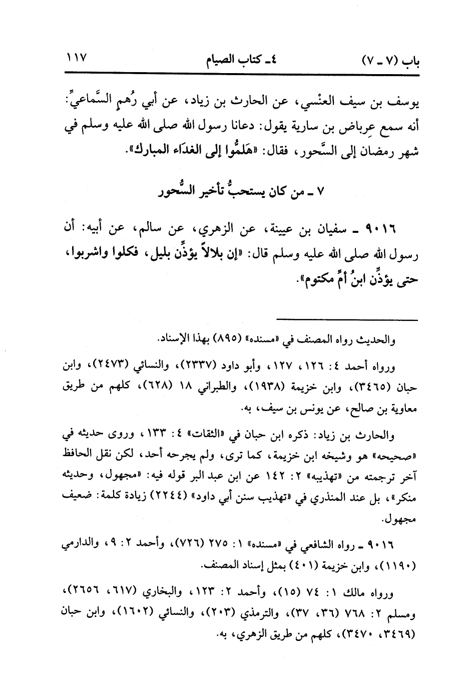 9016- حَدَّثَنَا سُفْيَانُ بْنُ عُيَيْنَةَ ، عَنِ الزُّهْرِيِّ ، عَنْ سَالِمٍ ، عَنْ أَبِيهِ ، أَنَّ رَسُولَ اللهِ صَلَّى الله عَلَيْهِ وَسَلَّمَ ، قَالَ : إنَّ بِلاَلاً يُؤَذِّنُ بِلَيْلٍ ، فَكُلُوا وَاشْرَبُوا حَتَّى يُؤَذِّنَ ابْنُ أُمِّ مَكْتُومٍ. (3/9).