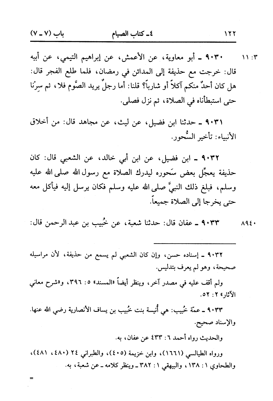 9032- حَدَّثَنَا ابْنُ فُضَيْلٍ ، عَنِ ابْنِ أَبِي خَالِدٍ ، عَنِ الشَّعْبِيِّ ، قَالَ : كَانَ حُذَيْفَةُ يُعَجِّلُ بَعْضَ سحُورِهِ لِيُدْرِكَ الصَّلاَةَ مَعَ رَسُولِ اللهِ صَلَّى الله عَلَيْهِ وَسَلَّمَ ، فَبَلَغَ ذَلِكَ النَّبِيَّ صَلَّى الله عَلَيْهِ وَسَلَّمَ ، فَكَانَ يُرْسِلُ إلَيْهِ فَيَأْكُلُ مَعَهُ حَتَّى يَخْرُجَا إلَى الصَّلاَةِ جَمِيعًا.