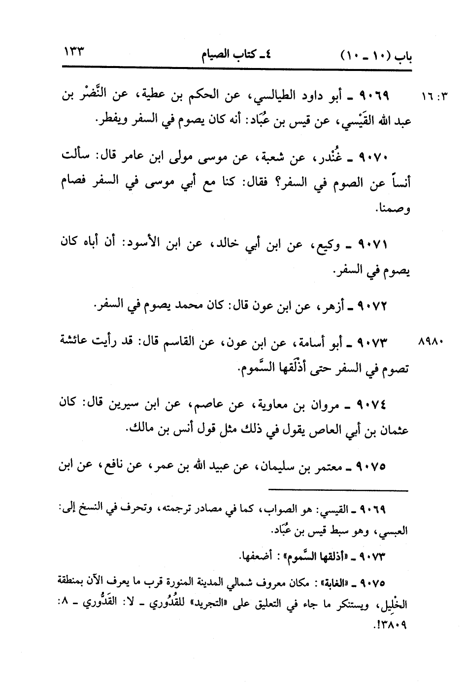 9075- حَدَّثَنَا مُعْتَمِرُ بْنُ سُلَيْمَانَ ، عَنْ عُبَيْدِ اللهِ بْنِ عُمَرَ ، عَنْ نَافِعٍ ، عَنِ ابْنِ عُمَرَ ؛ أَنَّهُ كَانَ يَخْرُجُ إلَى الْغَابَةِ فَلاَ يُفْطِرُ ، وَلاَ يَقْصُرُ. (3/16).