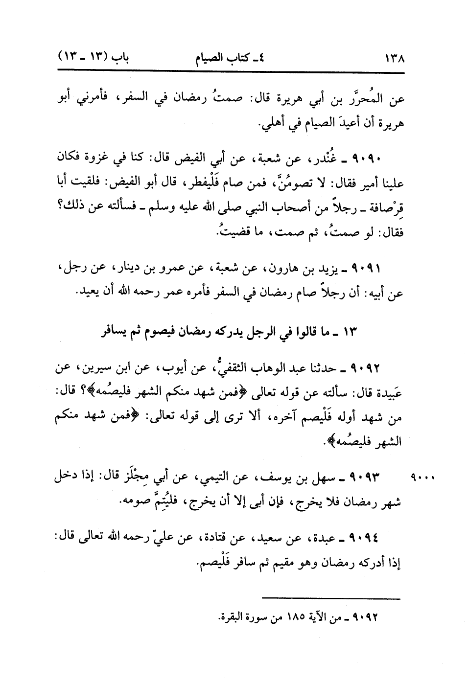 9092- حَدَّثَنَا عَبْدُ الْوَهَّابِ الثَّقَفِيُّ ، عَنْ أَيُّوبَ ، عَنِ ابْنِ سِيرِينَ ، عَنْ عَبِيْدَةَ ، قَالَ : سَأَلْتُُهُ عَنْ قَوْلِهِ تَعَالَى : {فَمَنْ شَهِدَ مِنْكُمُ الشَّهْرَ فَلْيَصُمْهُ} ؟ قَالَ : مَنْ شَهِدَ أَوَّلَهُ فَلْيَصُمْ آخِرَهُ ، أَلاَ تَرَى إلَى قَوْلِهِ تَعَالَى : {فَمَنْ شَهِدَ مِنْكُمُ الشَّهْرَ فَلْيَصُمْهُ}.