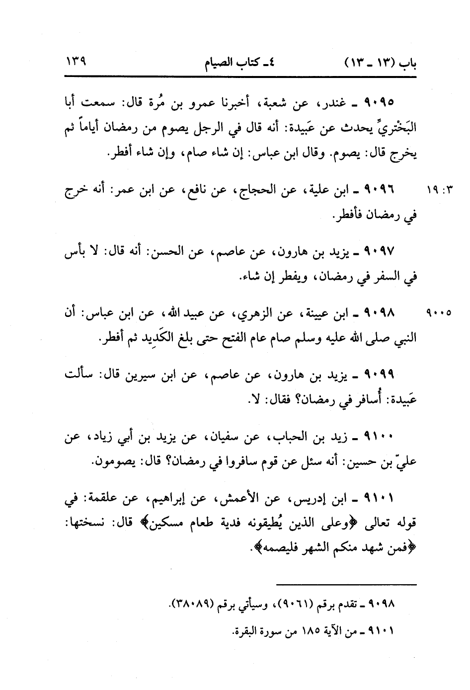 9098- حَدَّثَنَا ابْنُ عُيَيْنَةَ ، عَنِ الزُّهْرِيِّ ، عَنْ عُبَيْدِ اللهِ ، عَنِ ابْنِ عَبَّاسٍ ؛ أَنَّ النَّبِيَّ صَلَّى الله عَلَيْهِ وَسَلَّمَ صَامَ عَامَ الْفَتْحِ حَتَّى بَلَغَ الْكَدِيدَ ، ثُمَّ أَفْطَرَ.