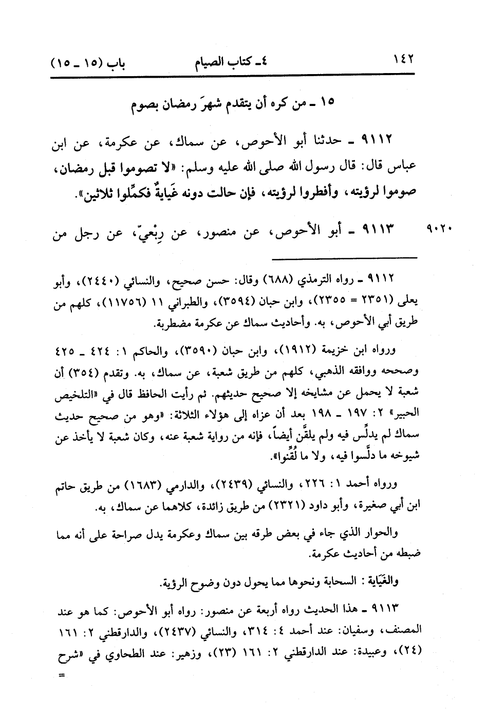 9113- حَدَّثَنَا أَبُو الأَحْوَصِِ ، عَنْ مَنْصُورٍ ، عَنْ رِبْعِيٍّ ، عَنْ رَجُلٍ مِنْ أَصْحَابِ النَّبِيِّ صَلَّى الله عَلَيْهِ وَسَلَّمَ ، قَالَ : قَالَ رَسُولُ اللهِ صَلَّى الله عَلَيْهِ وَسَلَّمَ : لاَ تَقَدَّمُوا الشَّهْرَ إِلاَّ أَنْ تَرَوْا الْهِلاَلَ ، أَوْ تُكْمِلُوا الْعِدَّةَ ، وَلاَ تُفْطِرُوا حَتَّى تَرَوْا الْهِلاَلَ ، أَوْ تُكْمِلُوا الْعِدَّةَ. (3/20).