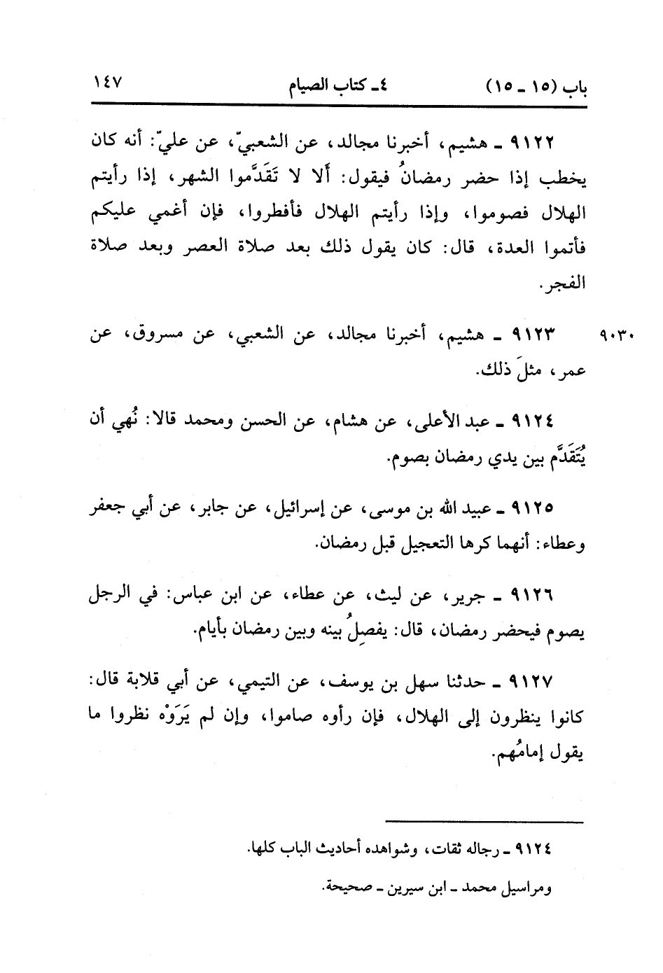 9122- حَدَّثَنَا هُشَيْمٌ ، قَالَ أَخْبَرَنَا مُجَالِدٌ ، عَنِ الشَّعْبِيِّ ، عَنْ عَلِيٍّ ؛ أَنَّهُ كَانَ يَخْطُبُ إذَا حَضَرَ رَمَضَانُ فَيَقُولُ : أَلاَ لاَ تَقَدَّمُوا الشَّهْرَ ، إذَا رَأَيْتُمَ الْهِلاَلَ فَصُومُوا ، وَإِذَا رَأَيْتُمَ الْهِلاَلَ فَأَفْطِرُوا ، فَإِنْ أُغْمِيَ عَلَيْكُمْ فَأَتِمُّوا الْعِدَّةَ ، قَالَ : كَانَ يَقُولُ ذَلِكَ بَعْدَ صَلاَةِ الْعَصْرِ ، وَبَعْدَ صَلاَةِ الْفَجْرِ.