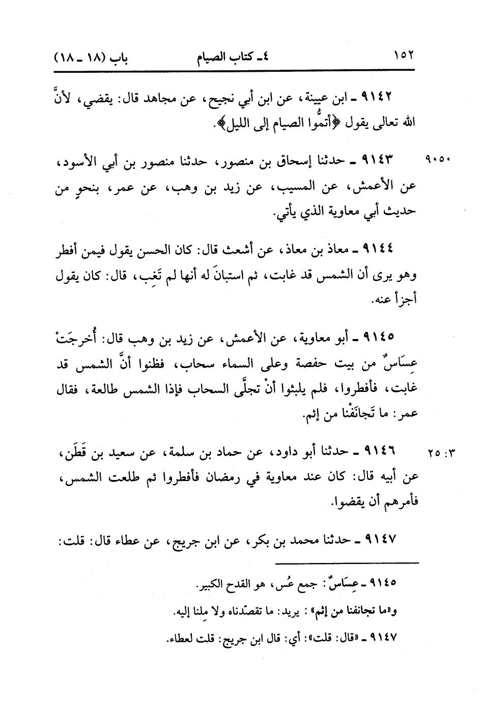 9145- حَدَّثَنَا أَبُو مُعَاوِيَةَ ، عَنِ الأَعْمَشِ ، عَنْ زَيْدِ بْنِ وَهْبٍ ، قَالَ : أُخْرِجَتْ عِسَاسٌ مِنْ بَيْتِ حَفْصَةَ وَعَلَى السَّمَاءِ سَحَابٌ ، فَظَنُّوا أَنَّ الشَّمْسَ قَدْ غَابَتْ فَأَفْطَرُوا ، فَلَمْ يَلْبَثُوا أَنْ تَجَلَّى السَّحَابُ فَإِذَا الشَّمْسُ طَالِعَةٌ ، فَقَالَ عُمَرُ : مَا تَجَانَفْنَا مِنْ إِثْمَ.