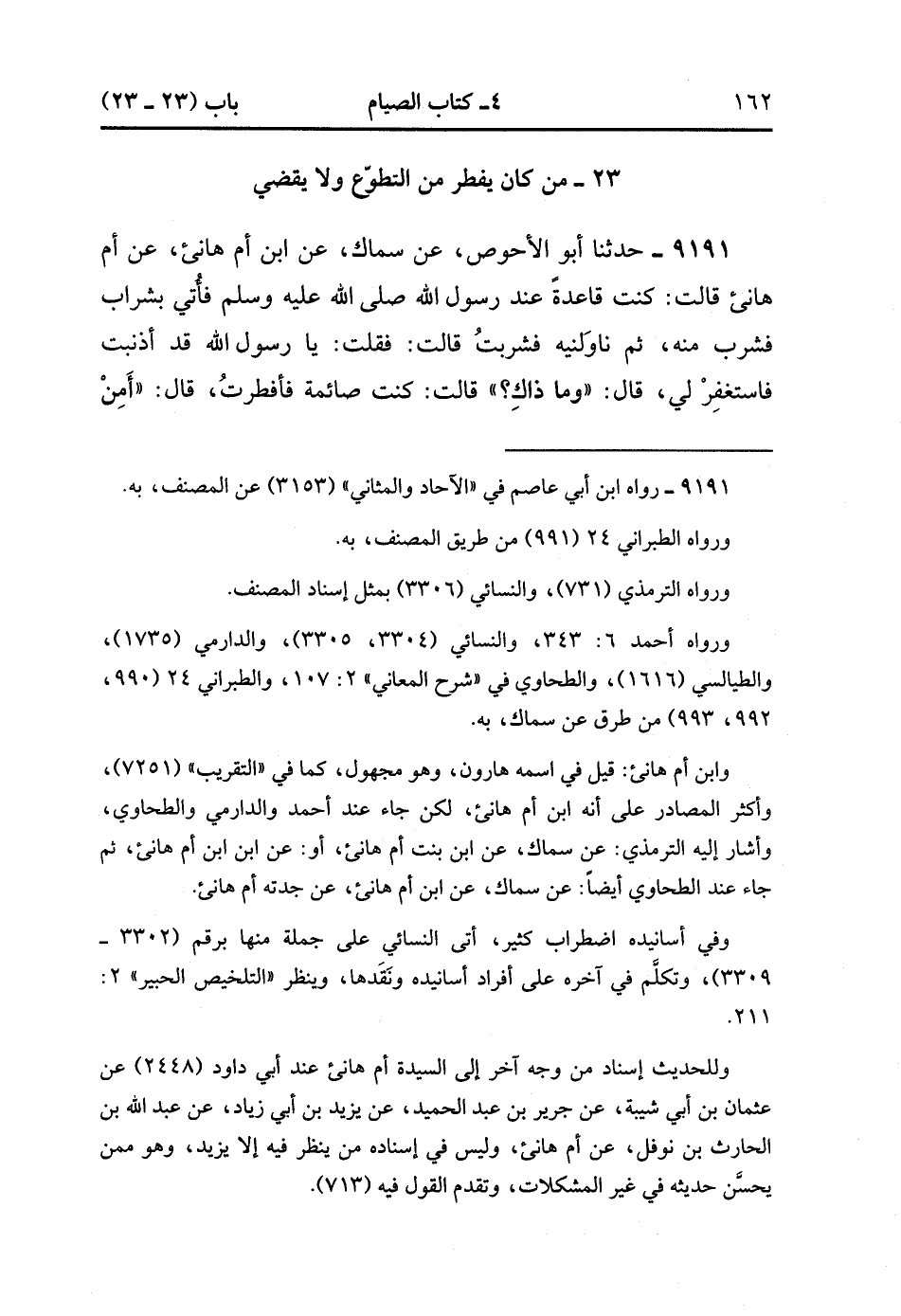 9191- حَدَّثَنَا أَبُو الأَحْوَصِِ ، عَنْ سِمَاكٍ ، عَنِ ابْنِ أُمِّ هَانِئٍ ، عَنْ أُمِّ هَانِئٍ قَالَتْ : كُنْت قَاعِدَةً عِنْدَ رَسُولِ اللهِ صَلَّى الله عَلَيْهِ وَسَلَّمَ ، فَأُتِيَ بِشَرَابٍ فَشَرِبَ مِنْهُ ، ثُمَّ نَاوَلَنِيهِ فَشَرِبْت قَالَتْ : فَقُلْتُ : يَا رَسُولَ اللهِ ، قَدْ أَذْنَبْت فَاسْتَغْفِرْ لِي ، قَالَ : وَمَا ذَاكَ ؟ قَالَتْ : كُنْت صَائِمَةً فَأَفْطَرْت ، قَالَ : أَمِنْ قَضَاءٍ كُنْت تَقْضِينَهُ ؟ قَالَتْ : لاَ ، قَالَ : لاَ يَضُرُّك. (3/30).