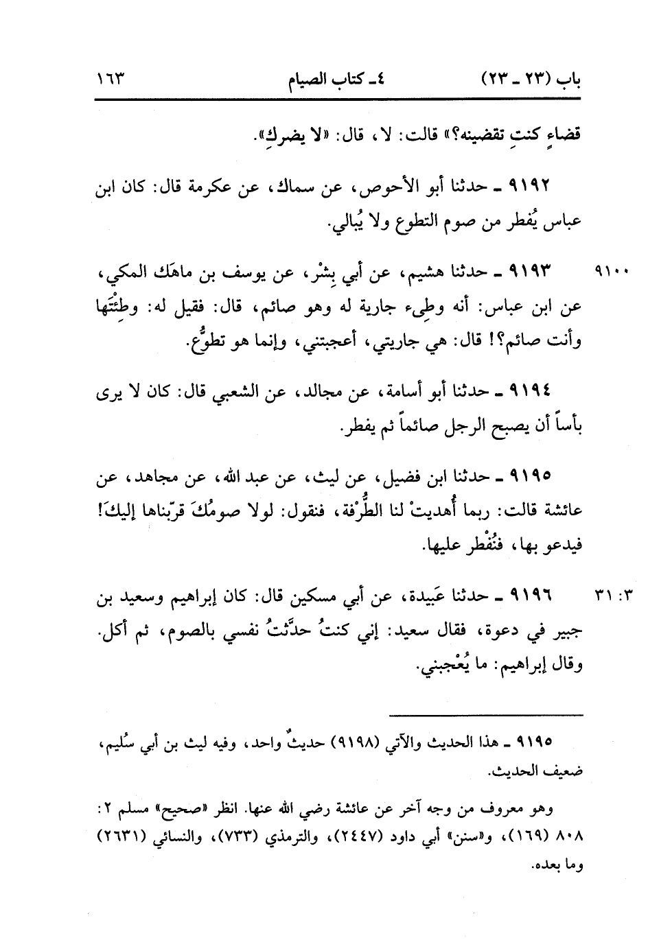 9193- حَدَّثَنَا هُشَيْمٌ ، عَنْ أَبِي بِشْرٍ ، عَنْ يُوسُفَ بْنِ مَاهَكَ الْمَكِّيِّ ، عَنِ ابْنِ عَبَّاسٍ ؛ أَنَّهُ وَطِئَ جَارِيَةً لَهُ وَهُوَ صَائِمٌ ، قَالَ : فَقِيلَ لَهُ : وَطِئْتهَا وَأَنْتَ صَائِمٌ ؟ قَالَ : هِيَ جَارِيَتِي أَعْجَبَتْنِي ، وَإِنَّمَا هُوَ تَطَوُّعٌ.