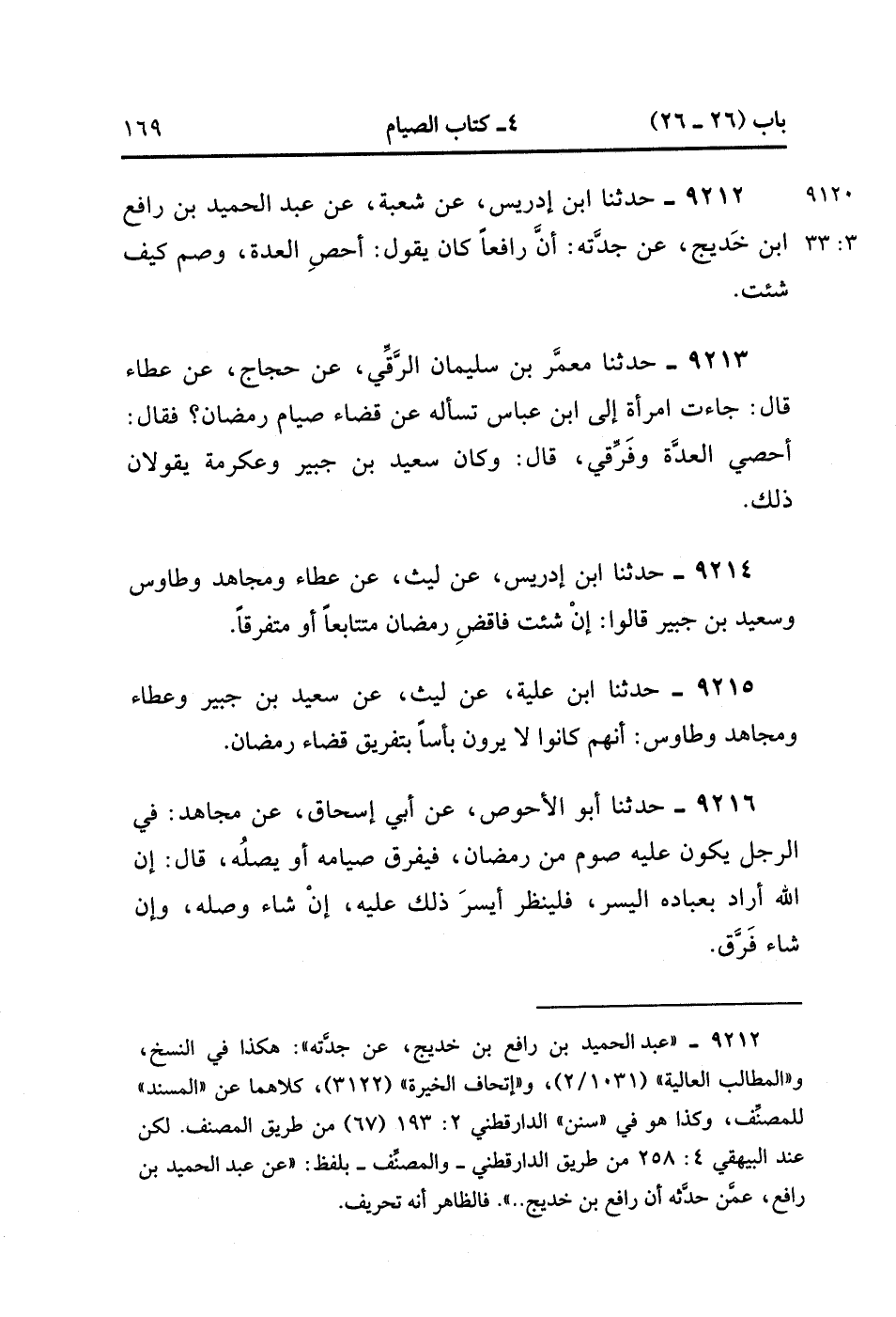9212- حَدَّثَنَا ابْنُ إدْرِيسَ ، عَنْ شُعْبَةَ ، عَنْ عَبْدِ الْحَمِيدِ بْنِ رَافِعِ بْنِ خَدِيجٍ ، عَنْ جَدَّتِهِ ، أَنَّ رَافِعًا كَانَ يَقُولُ : أَحْصِ الْعِدَّةَ وَصُمْ كَيْفَ شِئْت. (3/32)