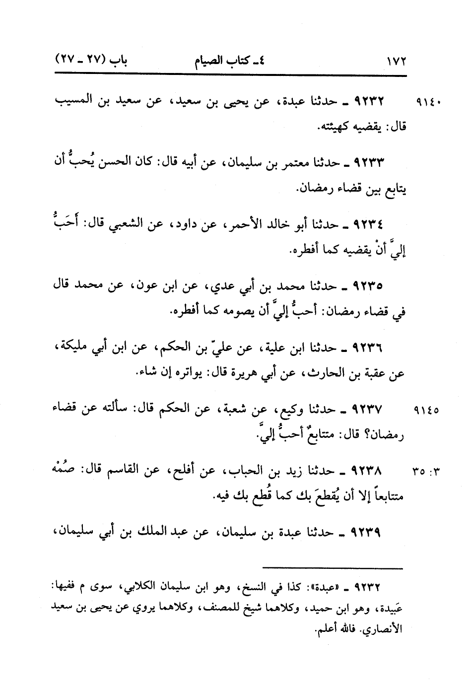 9238- حَدَّثَنَا زَيْدُ بْنُ الْحُبَابِ ، عَنْ أَفْلَحَ ، عَنِ الْقَاسِمِ ، قَالَ : صُمْهُ مُتَتَابِعًا إِلاَّ أَنْ يُقْطَعَ بِكَ كَمَا قَطَعَ بِكَ فِيهِ. (3/34).