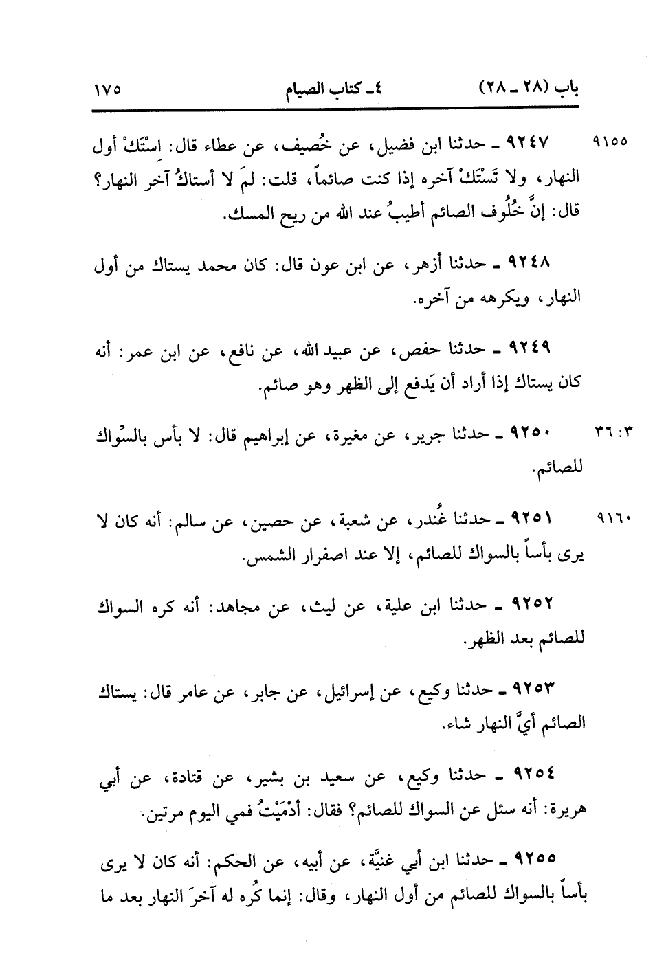 9251- حَدَّثَنَا غُنْدَرٌ ، عَنْ شُعْبَةَ ، عَنْ حُصَيْنٍ ، عَنْ سَالِمٍ ؛ أَنَّهُ كَانَ لاَ يَرَى بَأْسًا بِالسِّوَاكِ لِلصَّائِمِ ، إِلاَّ عِنْدَ اصْفِرَارِ الشَّمْسِ.