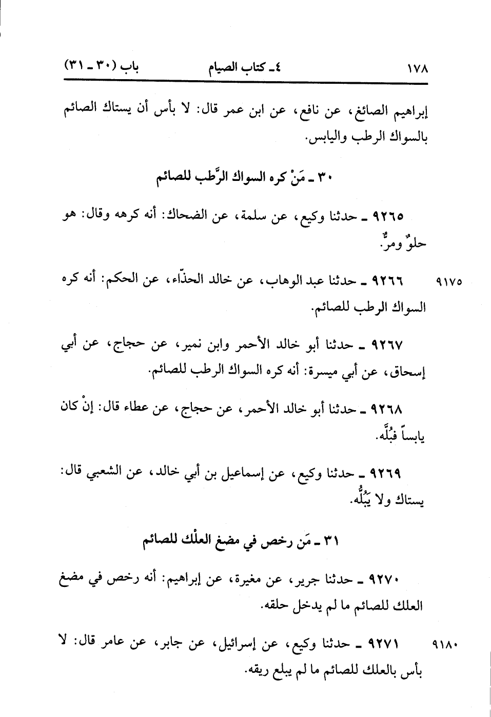 9271- حَدَّثَنَا وَكِيعٌ ، عَنْ إسْرَائِيلَ ، عَنْ جَابِرٍ ، عَنْ عَامِرٍ ، قَالَ : لاَ بَأْسَ بِالْعِلْكِ لِلصَّائِمِ مَا لَمْ يَبْلَعْ رِيقَهُ. (3/37).