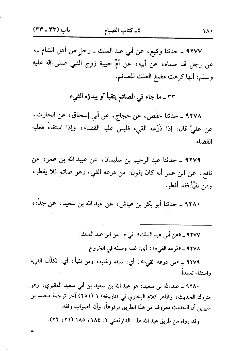 9280- حَدَّثَنَا أَبُو بَكْرِ بْنُ عَيَّاشٍ ، عَنْ عَبْدِ اللهِ بْنِ سَعِيدٍ ، عَنْ جَدِّهِ ، عَنْ أَبِي هُرَيْرَةَ ، قَالَ : قَالَ رَسُولُ اللهِ صَلَّى الله عَلَيْهِ وَسَلَّمَ : إذَا اسْتَقَاءَ الصَّائِمُ أَعَادَ. (3/38).