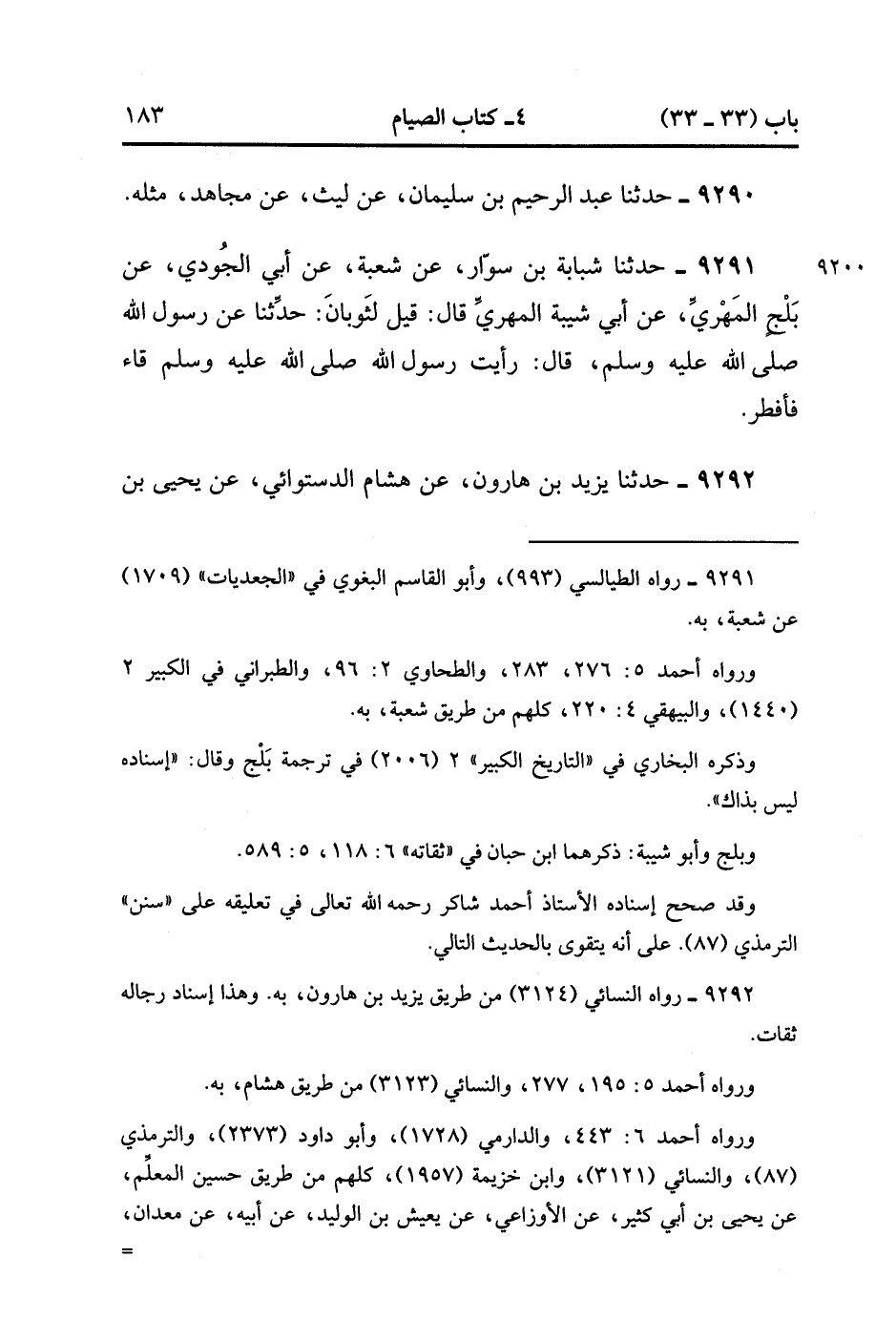 9292- حَدَّثَنَا يَزِيدُ بْنُ هَارُونَ ، عَنْ هِشَامٍ الدَّسْتُوَائِيِّ ، عَنْ يَحْيَى بْنِ أَبِي كَثِيرٍ ، عَنْ يعيش بْنِ الْوَلِيدِ بْنِ هِشَامٍ ، أَنَّ مَعْدَانَ أَخْبَرَهُ ، أَنَّ أَبَا الدَّرْدَاءِ أَخْبَرَهُ ؛ أَنَّ النَّبِيَّ صَلَّى الله عَلَيْهِ وَسَلَّمَ قَاءَ فَأَفْطَرَ ، قَالَ : فَلَقِيتُ ثَوْبَانَ ، فَقَالَ : أَنَا صَبَبْت لِرَسُولِ اللهِ صَلَّى الله عَلَيْهِ وَسَلَّمَ وَضُوءَهُ. (3/39).