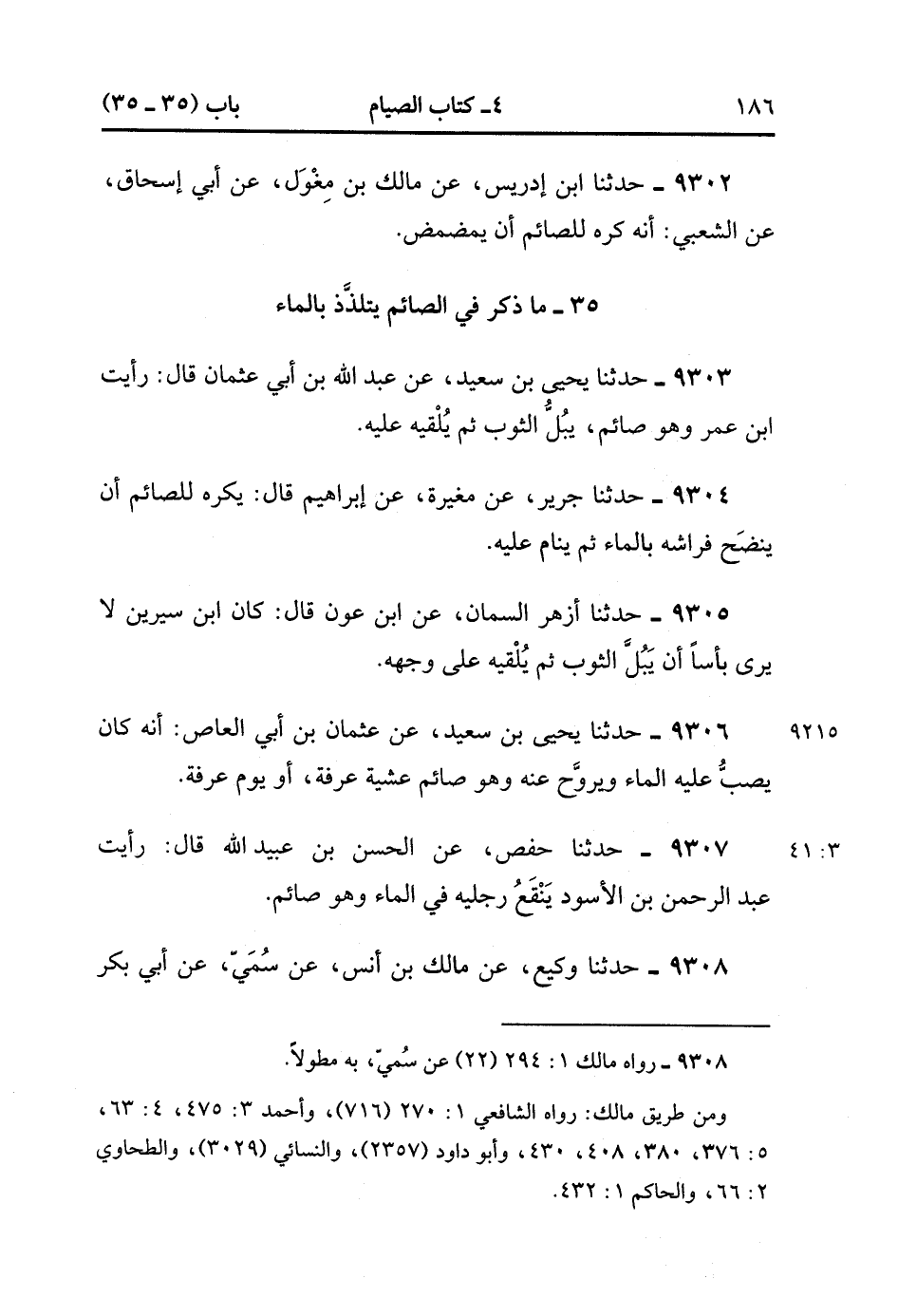 9308- حَدَّثَنَا وَكِيعٌ ، عَنْ مَالِكِ بْنِ أَنَسٍ ، عَنْ سُمَيٍّ ، عَنْ أَبِي بَكْرِ بْنِ عَبْدِ الرَّحْمَنِ بْنِ الْحَارِثِ ، عَنْ رَجُلٍ رَأَى النَّبِيَّ صَلَّى الله عَلَيْهِ وَسَلَّمَ يَصُبُّ عَلَى رَأْسِهِ الْمَاءَ وَهُوَ صَائِمٌ ، فِي يَوْمٍ صَائِفٍ. (3/41).