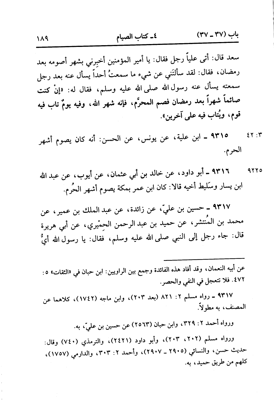 9317- حَدَّثَنَا حُسَيْنُ بْنُ عَلِيٍّ ، عَنْ زَائِدَةَ ، عَنْ عَبْدِ الْمَلِكِ بْنِ عُمَيْرٍ ، عَنْ مُحَمَّدِ بْنِ الْمُنْتَشِرِ ، عَنْ حُمَيْدِ بْنِ عَبْدِ الرَّحْمَنِ الْحِمْيَرِيِّ ، عَنْ أَبِي هُرَيْرَةَ ، قَالَ : جَاءَ رَجُلٌ إلَى النَّبِيِّ صَلَّى الله عَلَيْهِ وَسَلَّمَ ، فَقَالَ : يَا رَسُولَ اللهِ ، أَيُّ الصِّيَامِ أَفْضَلُ بَعْدَ رَمَضَانَ ؟ فَقَالَ : شَهْرُ اللهِ الَّذِي تَدْعُونَهُ الْمُحَرَّمَ. (3/42).