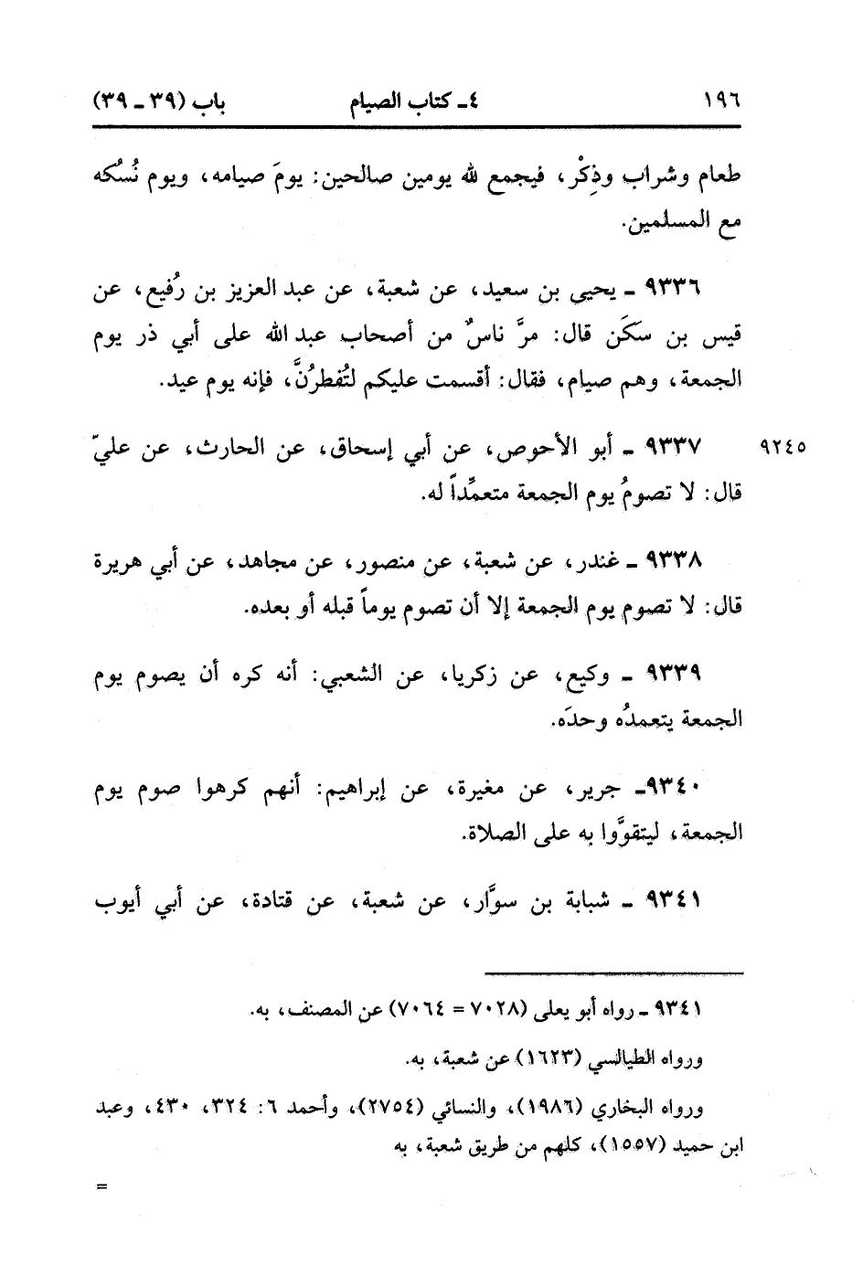 9340- حَدَّثَنَا جَرِيرٌ ، عَنْ مُغِيرَةَ ، عَنْ إبْرَاهِيمَ ؛ أَنَّهُمْ كَرِهُوا صَوْمَ يَوْمِ الْجُمُعَةِ لِيَتَقَوَّوْا بِهِ عَلَى الصَّلاَةِ. (3/44).