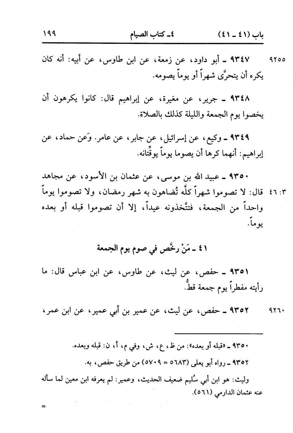 9348- حَدَّثَنَا جَرِيرٌ ، عَنْ مُغِيرَةَ ، عَنْ إبْرَاهِيمَ ، قَالَ : كَانُوا يَكْرَهُونَ أَنْ يَخُصُّوا يَوْمَ الْجُمُعَةِ وَاللَّيْلَةَ كَذَلِكَ بِالصَّلاَةِ.