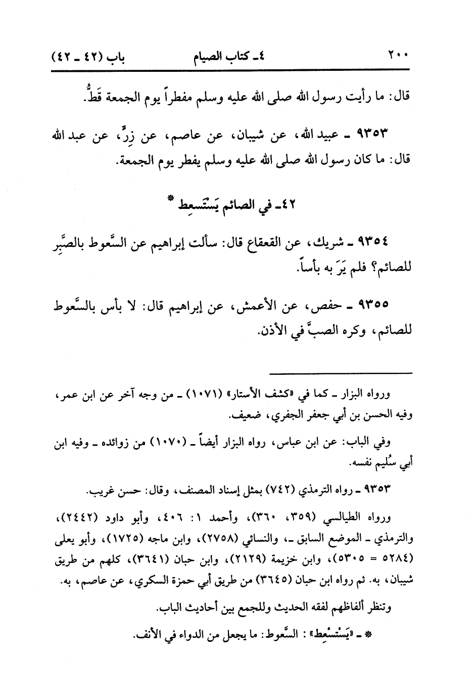9353- حَدَّثَنَا عُبَيْدُ اللهِ ، عَنْ شَيْبَانَ ، عَنْ عَاصِمٍ ، عَنْ زِرٍّ ، عَنْ عَبْدِ اللهِ ، قَالَ : مَا كَانَ رَسُولُ اللهِ صَلَّى الله عَلَيْهِ وَسَلَّمَ يُفْطِرُ يَوْمَ الْجُمُعَةِ.
