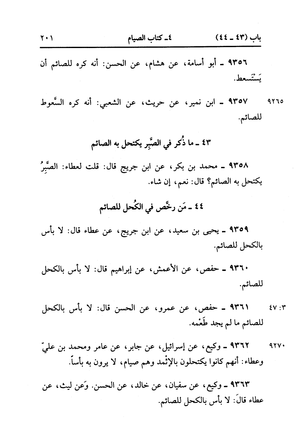 9363- حَدَّثَنَا وَكِيعٌ ، عَنْ سُفْيَانَ ، عَنْ خَالِدٍ ، عَنِ الْحَسَنِ (ح) وَعَنْ لَيْثٍ ، عَنْ عَطَاءٍ ، قَالَ : لاَ بَأْسَ بِالْكُحْلِ لِلصَّائِمِ. (3/47).
