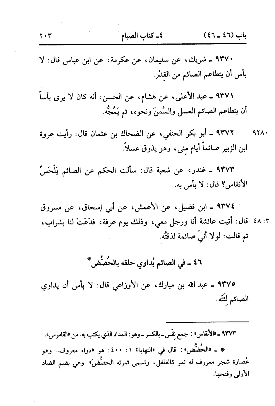 9375- حَدَّثَنَا عَبْدُ اللهِ بْنُ مُبَارَكٍ ، عَنِ الأَوْزَاعِيِّ ، قَالَ : لاَ بَأْسَ أَنْ يُدَاوِيَ الصَّائِمُ لِثَتَهُ. (3/48).