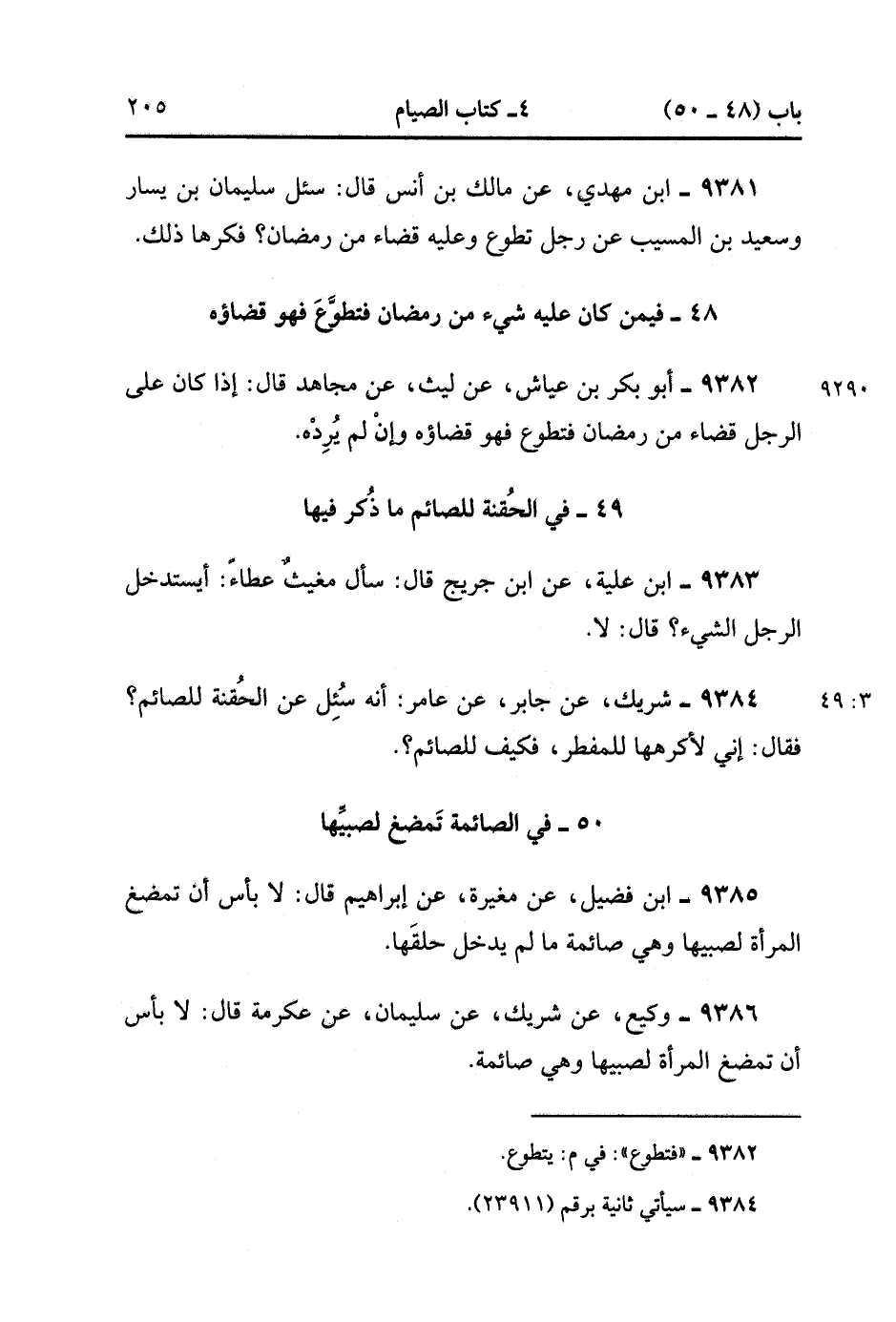 9386- حَدَّثَنَا وَكِيعٌ ، عَنْ شَرِيكٍ ، عَنْ سُلَيْمَانَ ، عَنْ عِكْرِمَةَ ، قَالَ : لاَ بَأْسَ أَنْ تَمْضُغَ الْمَرْأَةُ لِصَبِيِّهَا وَهِيَ صَائِمَةٌ. (3/49).