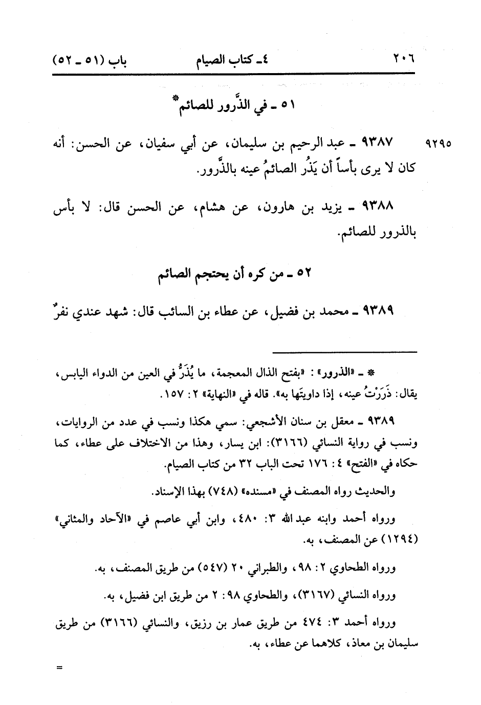 9388- حَدَّثَنَا يَزِيدُ بْنُ هَارُونَ ، عَنْ هِشَامٍ ، عَنِ الْحَسَنِ ، قَالَ : لاَ بَأْسَ بِالذَّرُورِ لِلصَّائِمِ. (3/49).
