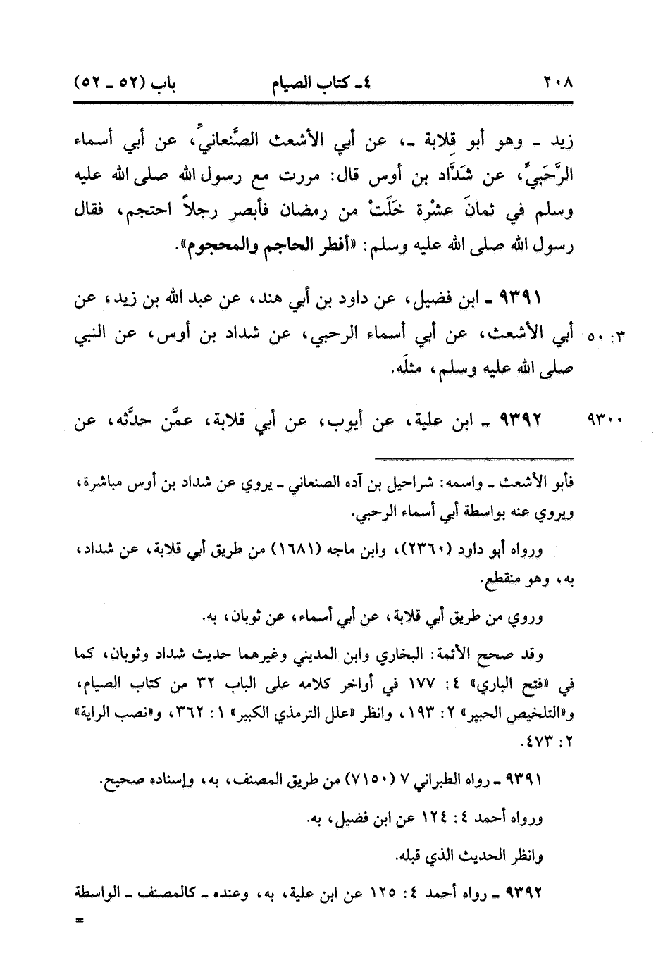 9392- حَدَّثَنَا ابْنُ عُلَيَّةَ ، عَنْ أَيُّوبَ ، عَنْ أَبِي قِلاَبَةَ ، عَمَّنْ حَدَّثَهُ ، عَنْ شَدَّادِ بْنِ أَوْسٍ ، قَالَ : أَتَى رَسُولُ اللهِ صَلَّى الله عَلَيْهِ وَسَلَّمَ عَلَى رَجُلٍ يَحْتَجِمُ بِالْبَقِيعِ ، وَهُوَ آخِذٌ بِيَدَيَّ لِثَمَانِ عَشْرَةَ خَلَتْ مِنْ رَمَضَانَ ، فَقَالَ : أَفْطَرَ الْحَاجِمُ وَالْمَحْجُومُ. (3/50).