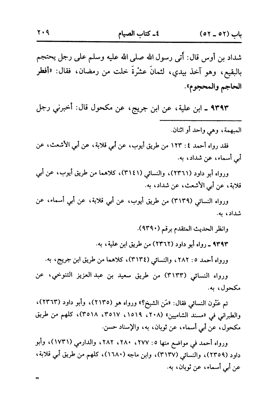 9393- حَدَّثَنَا ابْنُ عُلَيَّةَ ، عَنِ ابْنِ جُرَيْجٍ ، عَنْ مَكْحُولٍ ، قَالَ : أَخْبَرَنِي رَجُلٌ مِنَ الْحَيِّ مُصَدَّقٌ ، عَنْ ثَوْبَانَ ، أَنَّ رَسُولَ اللهِ صَلَّى الله عَلَيْهِ وَسَلَّمَ ، قَالَ : أَفْطَرَ الْحَاجِمُ وَالْمَحْجُومُ. (3/50).
