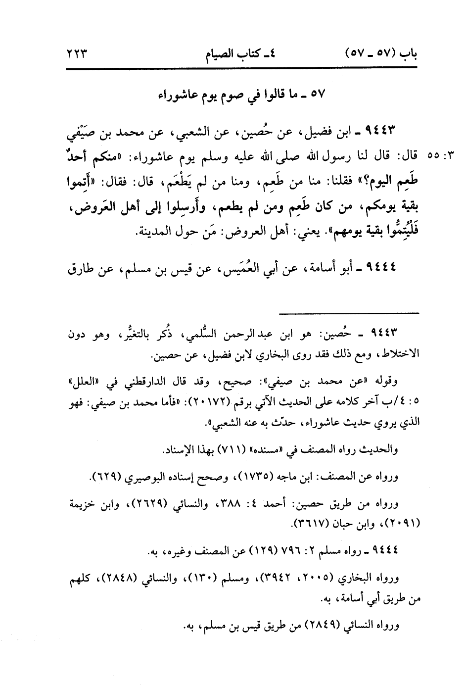 9444- حَدَّثَنَا أَبُو أُسَامَةَ ، عَنْ أَبِي الْعُمَيْسِ ، عَنْ قَيْسِ بْنِ مُسْلِمٍ ، عَنْ طَارِقِ بْنِ شِهَابٍ ، عَنْ أَبِي مُوسَى ، قَالَ : يَوْمُ عَاشُورَاءَ يَوْمٌ تُعَظِّمُهُ الْيَهُودُ تَتَّخِذُهُ عِيدًا ، فَقَالَ رَسُولُ اللهِ صَلَّى الله عَلَيْهِ وَسَلَّمَ : صُومُوهُ أَنْتُم. (3/55).