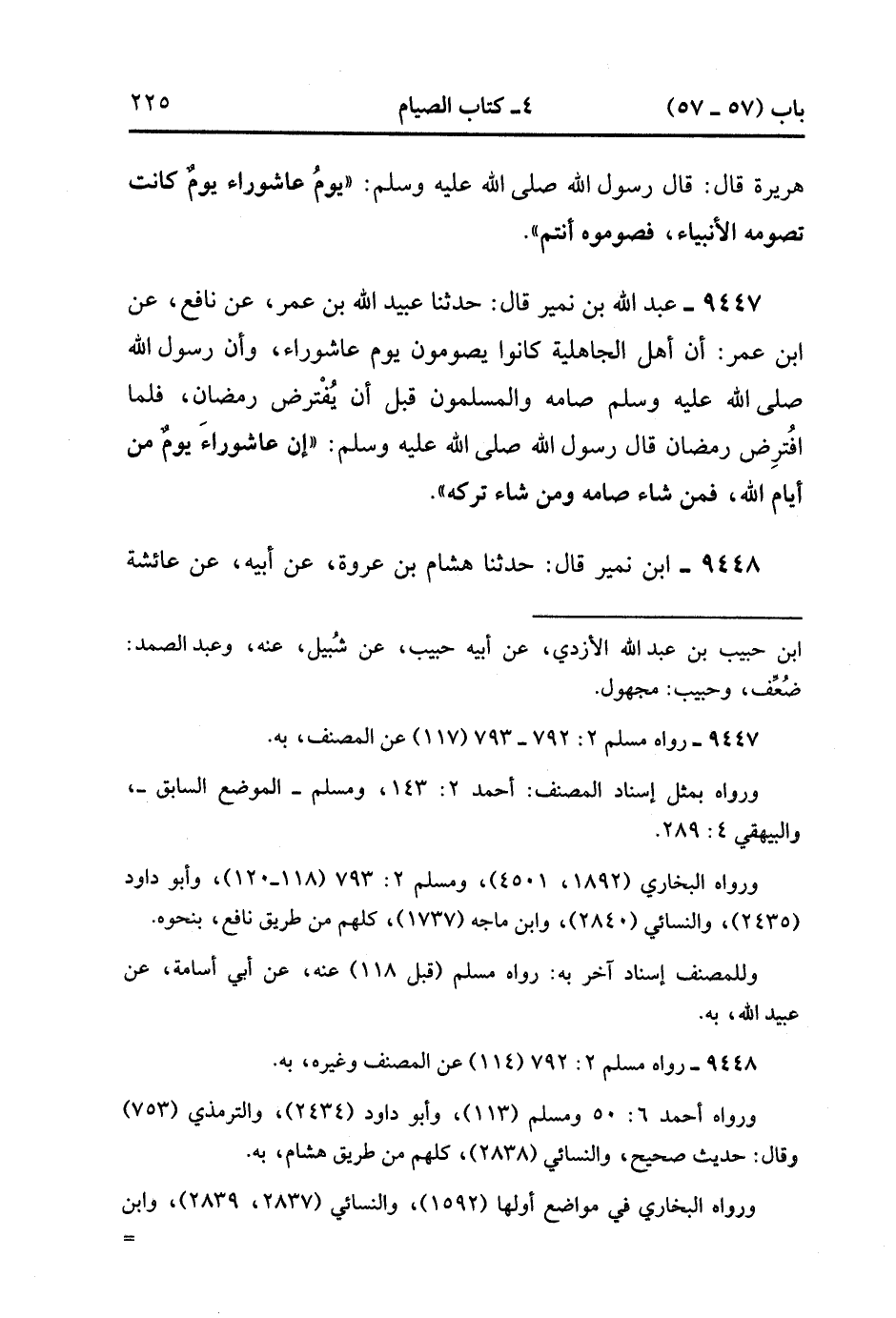 9448- حَدَّثَنَا ابْنُ نُمَيْرٍ , قَالَ : حدَّثَنَا هِشَامُ بْنُ عُرْوَةَ ، عَنْ أَبِيهِ ، عَنْ عَائِشَةَ قَالَتْ : كَانَ عَاشُورَاءُ يَوْمًا تَصُومُهُ قُرَيْشٌ فِي الْجَاهِلِيَّةِ ، فَلَمَّا قَدِمَ رَسُولُ اللهِ صَلَّى الله عَلَيْهِ وَسَلَّمَ الْمَدِينَةَ صَامَهُ ، وَأَمَرَ بِصِيَامِهِ ، فَلَمَّا فُرِضَ رَمَضَانُ كَانَ رَمَضَانُ هُوَ الْفَرِيضَةَ ، وَتَرَكَ عَاشُورَاءَ ، فَمَنْ شَاءَ صَامَهُ وَمَنْ شَاءَ تَرَكَهُ. (3/55).